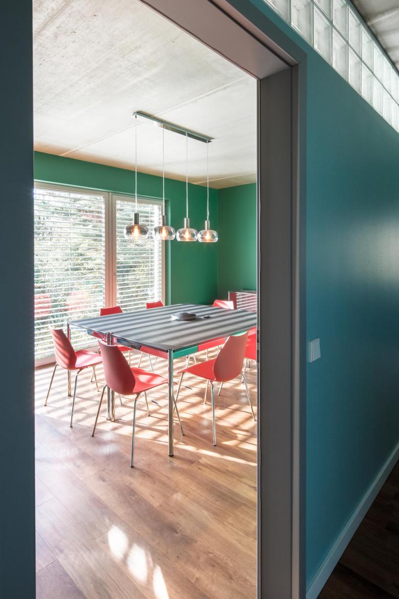 Der Arbeitsbereich sowie die Teeküche und die Besprechungsräume sind nach Süden ausgerichtet und bieten einen Blick in den Garten, während sich die Lager- und Sanitärräume auf der Nordseite des Gebäudes befinden. Die großzügigen Fensterflächen ermöglichen in der kalten Jahreszeit solare Wärmegewinne, während die Außenjalousien im Sommer vor Hitze schützen, ohne die Sicht nach draußen zu beeinträchtigen. Die massiven Wände sind mit Kratzputz in hellem Salbeigrün verputzt, der gut mit den rötlich-ockerfarbenen Fensterrahmen sowie den rötlichen Pflasterklinkern an der Eingangstreppe und den Balkonbrüstungen harmoniert.