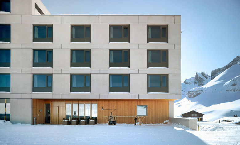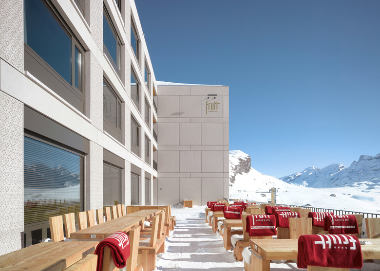 Das neue Hotel Frutt Lodge & Spa auf der Melchsee-Frutt ersetzt das im Jahre 2004 bei einem Brand zerstörte alte Sporthotel Kurhaus Frutt. Die zurückhaltende und einfache Form des ehemaligen Gebäudes wurde übernommen. Der Hotelbau setzt sich in den Kontrast zur Bergwelt, welche dadurch noch imposanter und majestätischer erscheint. Die äussere robuste Struktur beherbergt Innenräume, welche eine angenehme Geborgenheit ausstrahlen. Massive Eichenholzböden, hochwertige Holzverkleidungen und unterschiedliche Textilien erzeugen eine gemütliche und warme Atmosphäre. Das Hotel Frutt Lodge & Spa besteht aus 16 Appartements im östlichen Gebäudeteil, 58 Hotelzimmern und 3 Suiten. Einladend sind die grosse, zweigeschossige Hotelhalle und die schönen Restaurants, welche eine grandiose Aussicht auf den Melchsee und die Berglandschaft bieten. Hier kommt der Lodge-Gedanke besonders zur Geltung. Die Bäder-Anlage im Sockel des Gebäudes überrascht durch die vielfältige räumliche Gestaltung.