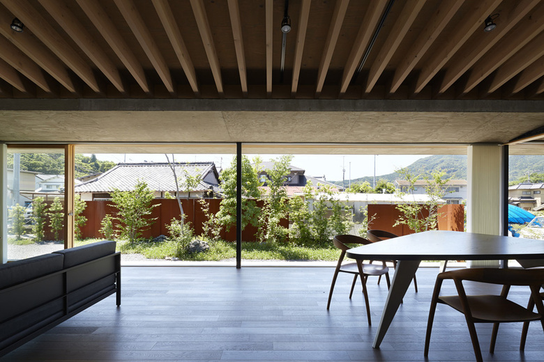 The structure is a mixture of RC and wood. RC was selected for the large openings to the south garden and for the waterproofing of the green roof, while wood was used for the rest of the structure. Furthermore, the RC structure bears the horizontal forces, making it unnecessary to have walls to bear the horizontal forces in the wooden structure, thus expanding the LDK.