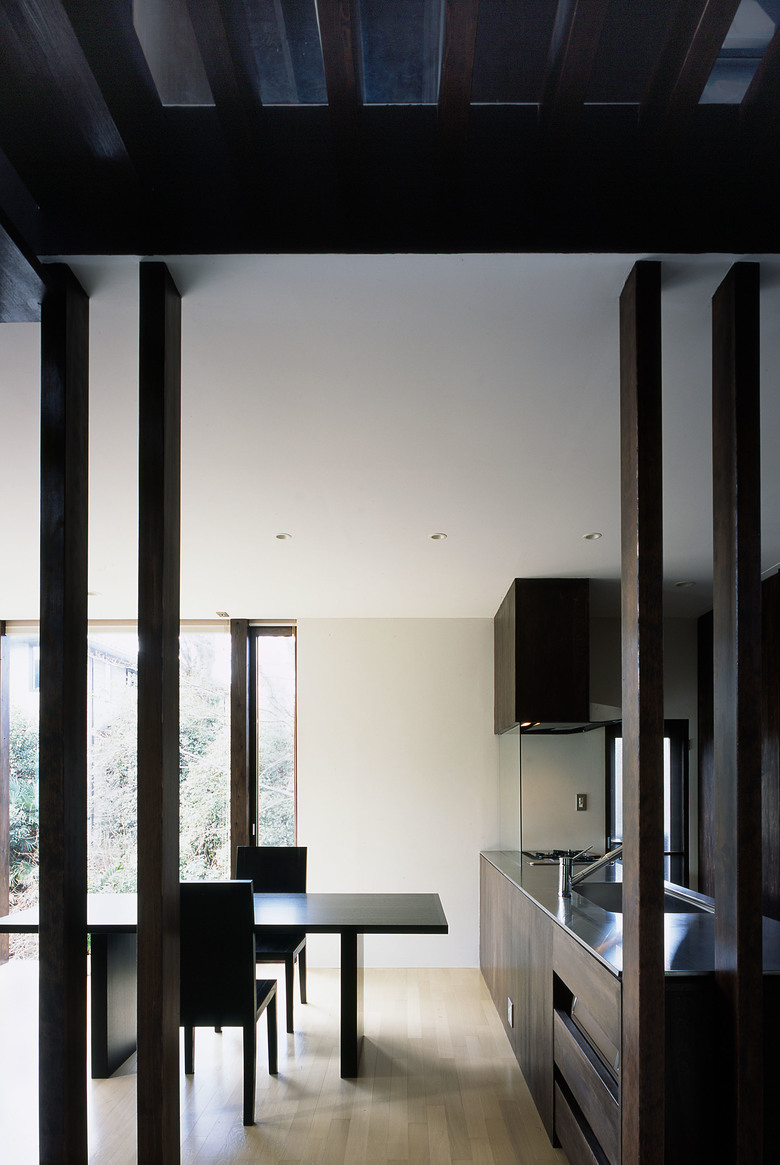 南側の大開口によって繋がれたリビングと外部デッキ空間が, 敷地西側を流れる鎌倉滑川渓谷対岸の既存樹木の緑を取り込むためのステージとなっている. シンプルな材料を厳選し採用したローコスト在来木造住宅である.