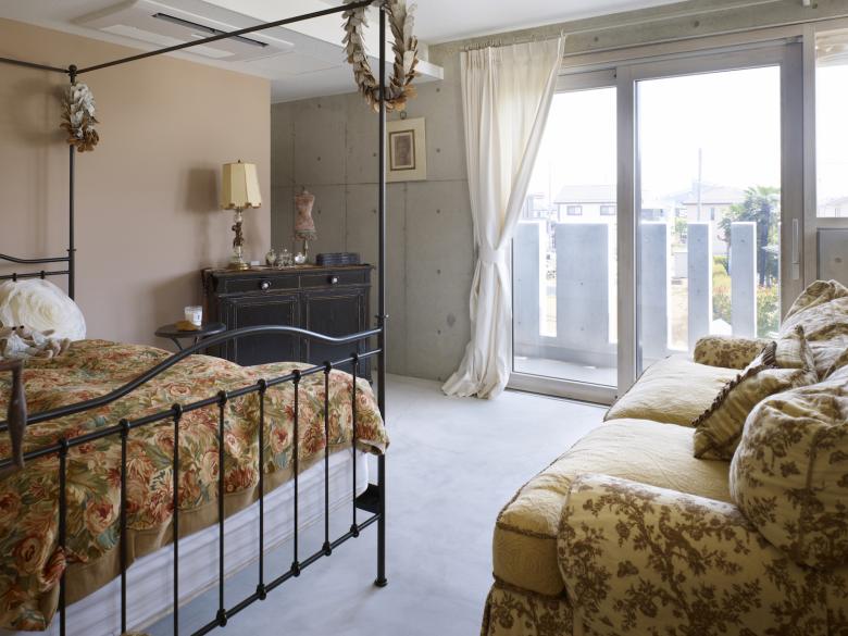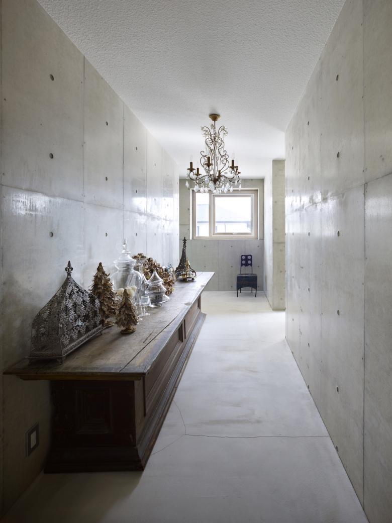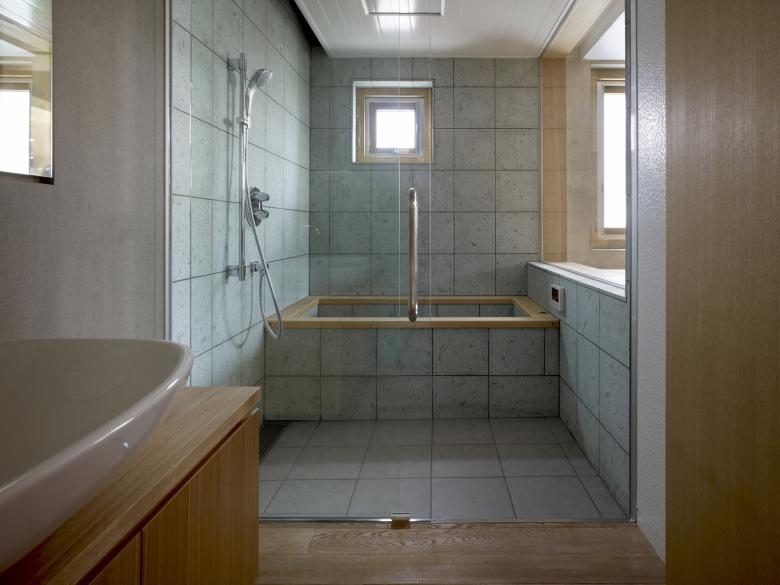 外観はコンクリート打放しのクールな印象で、断熱材を裏打ちしたFRC打込み型枠による「外断熱工法」を採用しており、室内空間全体が外断熱でしっかりと包まれる。加えて開口部に高性能のアルミ木複合サッシを用いることで、夏涼しく、冬温かい、エネルギー効率の高い安定した室内環境を生み出している。高い意匠性を守りながらも、熱負荷を低く抑え、年間を通じて快適な温熱環境を実現することを目指した。