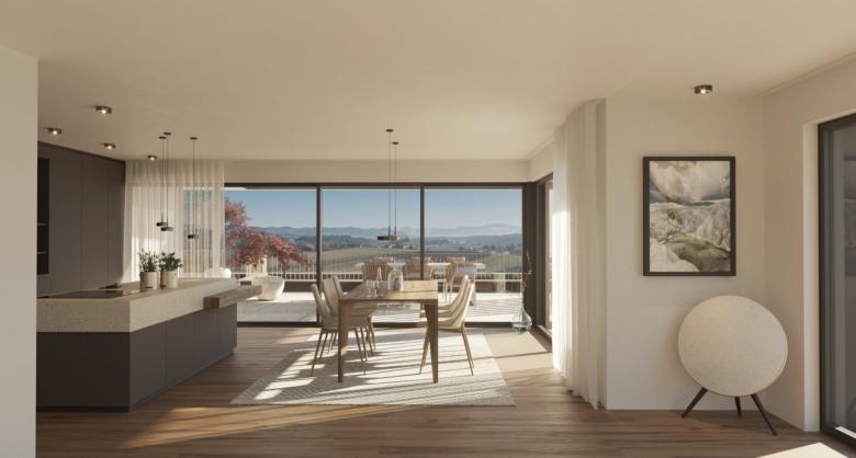 Die Küche als Angelpunkt, integriert im Wohnbereich, ist klarer Ausdruck des Zeitgeistes. Die loftartige Gestaltung vermittelt Offenheit und grosszügige Raumaufteilung. Die erstklassige und designvollendete Umsetzung der Küchen und Bäder ist ein echter Blickfang. Vertikale Lamellen dienen als Raumteiler welche durch die Aufteilung luftig und leicht wirken. Hochwertige Geräte und Funktionalität im stilvollen Ambiente begeistern. Edler Parkettboden oder fugenloser Spachtelbelag gehören ebenso zum exklusiven Finish wie schall- und energieeffiziente, raumhohe Fenster. Diese sorgen für ein offenes, angenehmes Wohnklima mit spektakulärer Aussicht auf die Berge und den Alpen und geben den Wohnungen die gewünschte Grosszügigkeit und Weite.