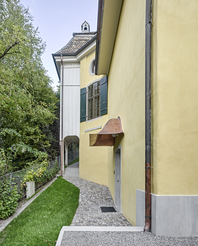 Im UG wird die neue Raumfassung mit dem einfachen Mittel der Farbe auf dem eindrücklich geformten Gewölbe erzeugt und sucht die Stimmung einer Klause. Anders der Dachraum, dort wird die Geometrie des Mansardendaches reflektiert und zeichnet das Bild einer textilen «schinkel‘schen» Zeltfigur ab.