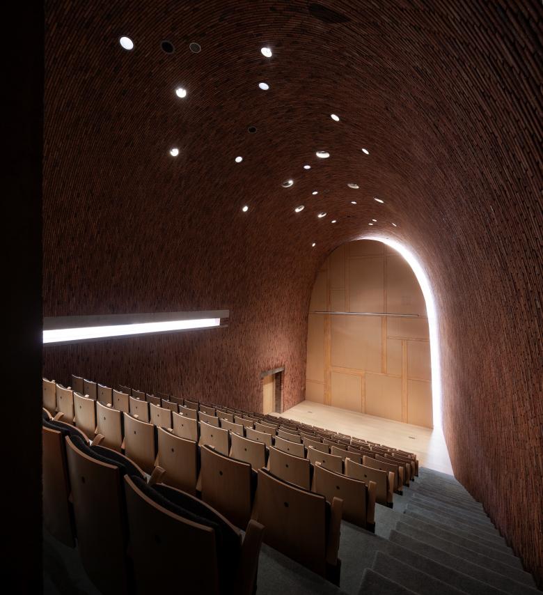 When one walks on the bridge, enters the foyer, and turns left, he will pass a series of arched exhibition spaces lightly varied in size and with contradicting openness (enclosed or open to the sky) to encounter a gentle stair, in the end, flowing down to the underground level with five sunken courtyards. Meanwhile, people can obtain a three-in-one (kilns-porcelains-people) museum experience when they see those porcelain, ruins, and sunken courtyards which create manifold layers' experiences with ancient bricks on the façade. As someone turns right at the foyer, he will respectively pass the bookstore, cafe, tea room, and finally reach a semi-outdoor area under the arch, witnessing a picturesque scene. When daytime surfaces, these arches reflect the waves of water while low horizontal gaps tempt people to sit down on the floor to see the long horizon of the Imperial kiln ruins. A similar surprise would be created when someone sees the Longzhu Pavilion of the Imperial kiln ruins through the vertical seams when he is on the way to the auditorium before accessing the foyer.