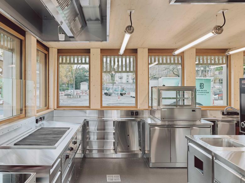 Die axialsymmetrische Stadthausanlage befindet sich an zentraler und prominenter Lage in der Stadt Zürich. Der geschichtsträchtige Ort wurde in mehreren Etappen umgestaltet. Der baumbestandene Platz fungiert als Verbindungsglied und schafft den Übergang zwischen Stadt und See. Südlich der Anlage befindet sich der Bürkliplatz mit der Quaianlage und der Schiffanlegestelle. Die Stadthausanlage ist mit einem dichten und regelmässigen Raster aus unterschiedlichen Bäumen bepflanzt. Mittig, als Zentrum und Herzstück der Anlage, befindet sich der inventarisierte Maillard-Pavillon. Das neue Kioskgebäude gesellt sich auf selbstverständliche Weise zu den bestehenden peripheren Kleinbauten. Die Volumetrie des neuen Kiosks zeigt sich als kompakter, eingeschossiger Gebäudekörper. Das Längsvolumen wird parallel zur Fraumünsterstrasse entlang der östlichen Perimetergrenze situiert. Durch diese volumetrische Anordnung entsteht ein gebührender Abstand zum Maillard-Pavillon und eine angemessene Dichteverteilung innerhalb der Stadthausanlage. Es entsteht ein Ort mit hoher Aufenthaltsqualität ohne die Verbindung der Fussgängerdiagonalen zu beeinträchtigen. Das neue Kioskgebäude tritt als zurückhaltender und dennoch selbstbewusster Baukörper in Erscheinung. Das äussere Erscheinungsbild ist geprägt von einer facettierten und reliefartigen Gebäudehülle. Zeichnend für die Fassade sind die vertikalen Fassadenstützen. Sie gliedern den Baukörper in seiner Länge und fügen die unterschiedlichen Nutzungen und Fassadenöffnungen zu einer einheitlichen Gesamterscheinung zusammen. Die abgerundeten auskragenden Fassadenstützen tragen das ausladende Dach und charakterisieren den äusseren Ausdruck. Sie schaffen eine entfernte Verwandtschaft zur Formgebung der inventarisierten Bestandsbauten ohne diese imitieren zu wollen.