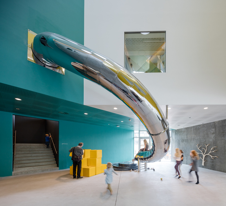 The route through the building focuses on developing and encouraging alternate forms of movement. The Labyrinth gets people on their hands and knees climbing through a three-dimensional network of cubes from the second to third floors; or alternatively they could take the Mousetrap, a vertical maze. A net, which spans several floors throughout the building, lets users climb up from floor to floor – suspended over the voids – and slides and firefighter poles offer a fast way to get back down. To cater for all abilities and ages, both easier and more standard ways of moving around are provided but even then, a visual connection is maintained throughout Ku.Be.
