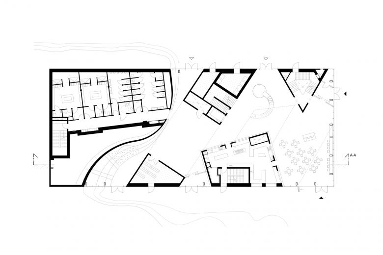 The urban gardens outside form the connection between Ku.Be and the urban realm, playing an important role in expressing the six volumes and the activities happening inside. The diverse landscape - a system of microclimates with changing sounds, lights and scents - blends seamlessly into the interior hill with integrated slides that reaches out into the gardens and ends in an amphitheater outside.