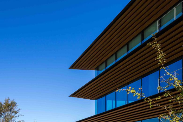 外周の3mの庇は執務空間への直射を抑制しながら、中央のステップテラスがオフィスの中央部と下階まで光を導く。冬季日照の少ない北陸でも、明るさを最大限に享受できる環境となっている。