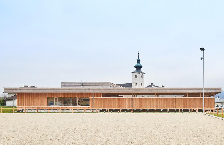 Das Gebäude des Pferdebetriebes wurde im nordöstlichen Bereich des Baufeldes im direkten Bezug zum bestehenden Hof der Landwirtschaft und zur Remise angeordnet. Dadurch können bestmögliche Synergien im Betrieb genutzt werden. Die Reithalle im Osten und die Ställe im Westen sind im Norden durch einen Zwischentrakt und im Süden durch eine überdachte Verbindung verbunden. Die Zugänge zur Reithalle erfolgen über die Längsseite jeweils vom Zwischentrakt sowie über die überdachte Verbindung. Der Zuschauerbereich im Süden der Halle wurde im Nahebezug zum Reitplatz angeordnet. Im nördlichen Zwischentrakt zwischen Stall und Reithalle befinden sich Waschbox und Sattelkammer.