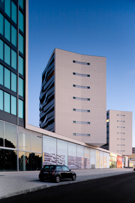 The total building comprises 89 apartments in three blocks over a commercial volume. The east volume has the smallest housing, in order to consume less common vertical access. The twin volumes, rotated in 45º, achieve total landscape view. For this, the structure had to be carefully worked to allow the most habitation types for the emergent market. The structure presents only four pillars each side of the rigid nucleon of the lifts. The volumes have a metal skin façade over the glazed one to protect it from solar heat and road noise. This kind of crackled mask for the balconies improves acoustic comfort by reducing the noise up to 22db.