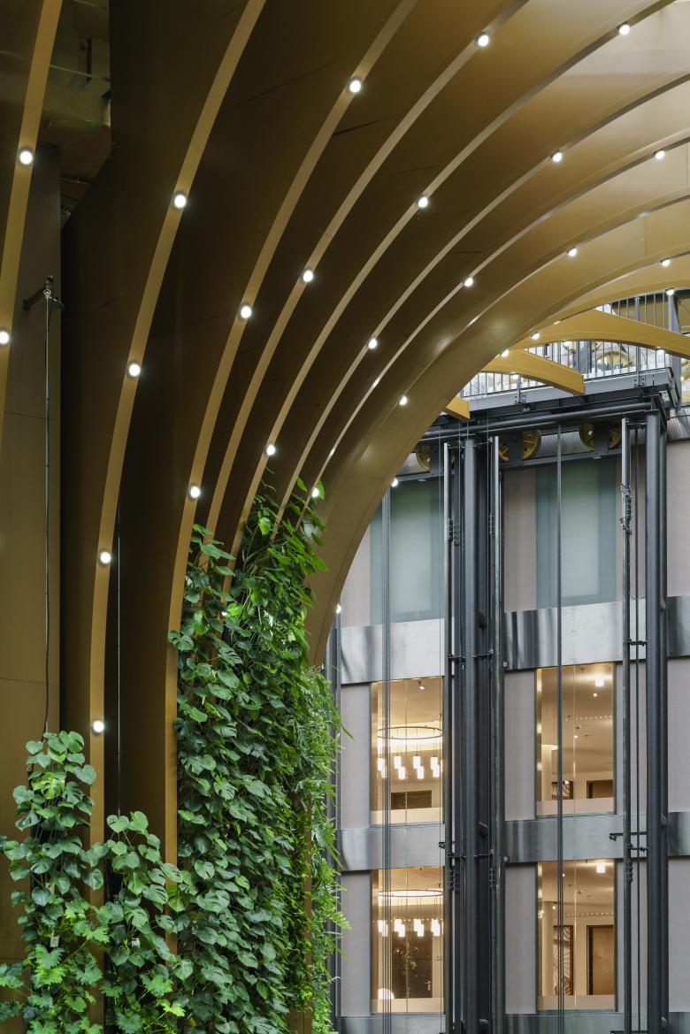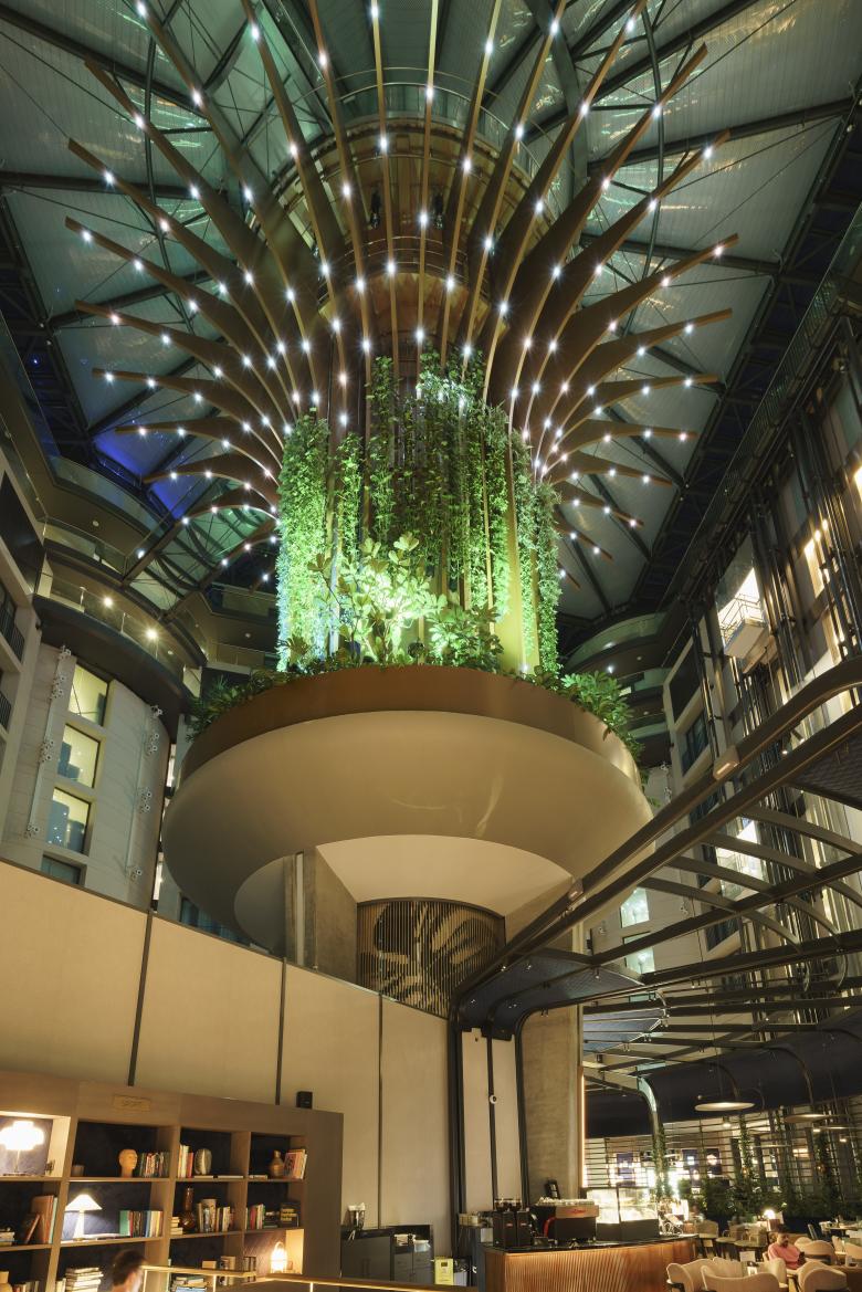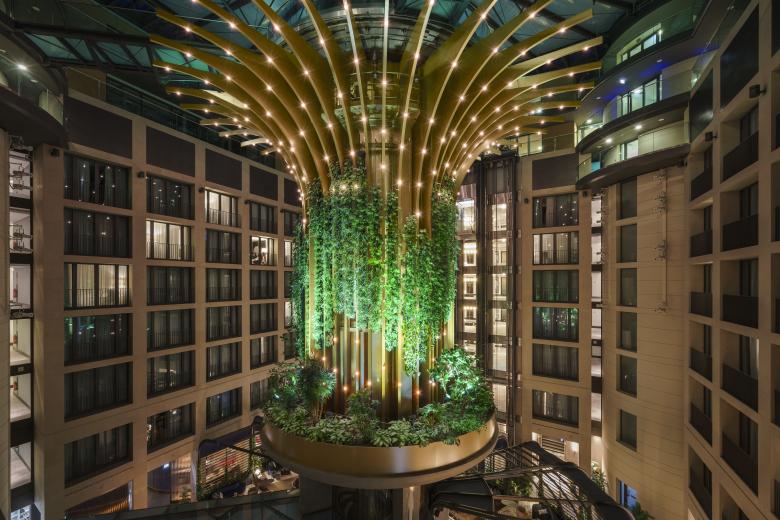 Die Installation Living Tree im Innenhof des Radisson Berlin integriert einen vertikalen Garten in eine Lamellenstruktur.