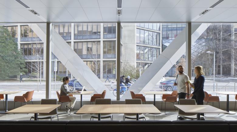 The project is targeting LEED Platinum certification through several strategies. The double-skin facade reduces energy use by an estimated 31 percent below the LEED v4 baseline. SOM prioritized Red List Free materials for the interiors, and with warm finishes in the lower floors, the plethora of communal spaces, and daylighting, the building is designed for the health of students and faculty. Potable water use has been reduced by nearly 40 percent below the Environmental Protection Agency’s baseline through efficient fixtures, and that strategy is supplemented by onsite stormwater management, a large green roof, and flood resistance, with the building rising two feet above street level.