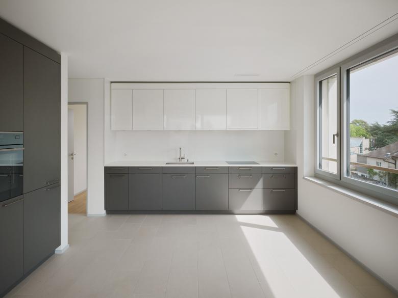 Durch einen Versatz im Volumen entsteht rückwärtig ein räumlich gefasster Gartenbereich, der mit dem grossen bestehenden Kirschbaum atmosphärisch geprägt wird. Dieser soll erhalten werden. Der Gebäudeeinschnitt zur Strasse markiert als einladende Geste die Lage der Zugänge zu Gewerbefläche und Wohnungstreppenhaus. So entsteht eine Gebäudeform, die das nutzungsbedingt grössere EG mit den Wohngeschossen zu einer Einheit verwebt. Der Sockel mit Gewerbe bildet eine breite Front zur Strasse und somit einen der Nutzung entsprechenden Auftritt. Der gegliederte Aufbau vermeidet hingegen eine zu wuchtige Erscheinung und führt das Gebäude auf einen sensiblen Massstab zurück. Die plastische Ausformung des Körpers entsteht aber auch aus dem Anspruch einer guten Belichtung und Belüftung aller Wohnungen. Diese erhalten durchgehend eine vierseitige Orientierung und somit einen individualisierten Charakter von hoher Wohnqualität.