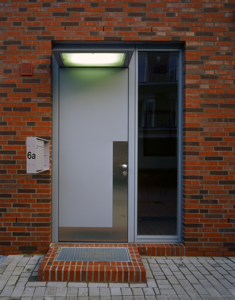 Die Erdgeschosswohnungen erhalten jeweils einen Gartenteil. Alle anderen Wohnungen haben einen Südbalkon bzw. eine Dachterrasse. Die Wohnungen sind Nord-Süd orientiert. Schlafräume, Bäder und Küchen sind nach Norden zur Strasse orientiert, die Wohnräume nach Süden zum Innenhof. Das gestaltprägende Material ist ein dünnformatiger, mehrfarbig sortierter Ziegelverblender. Hausweise wurde der Verblender unterschiedlich verwendet.