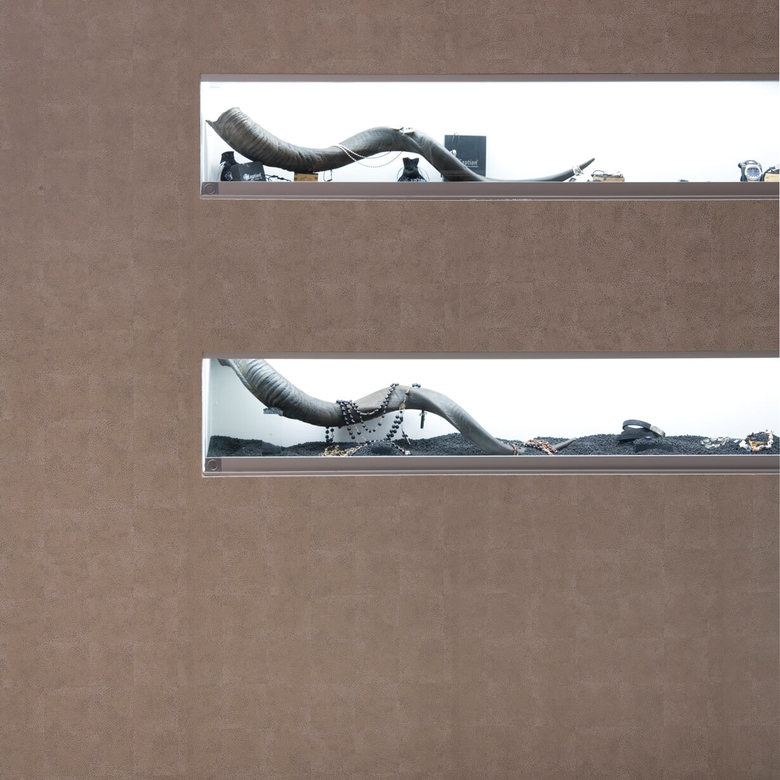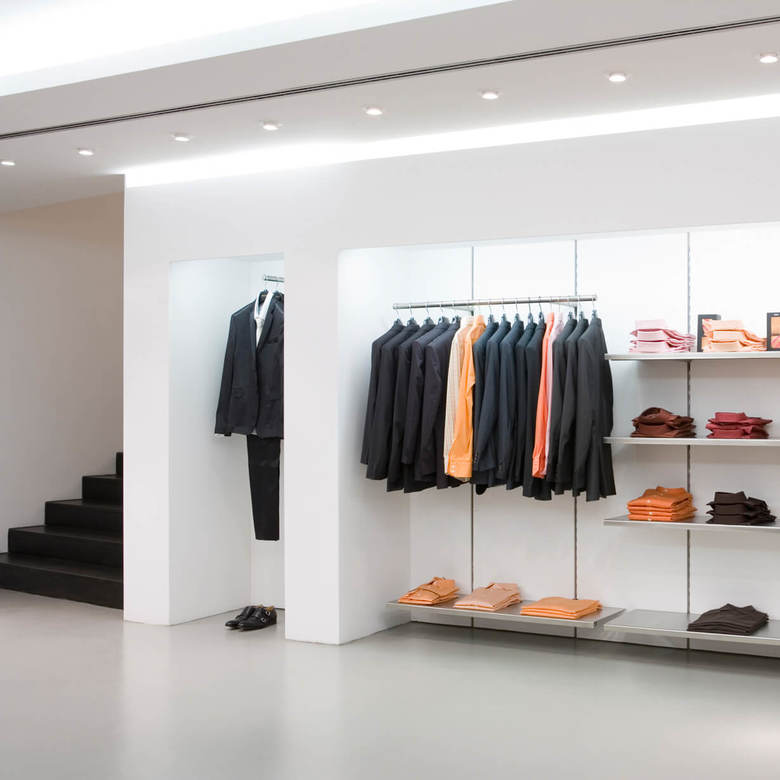 Der Totalumbau des Ladens ließ eine komplette Neugestaltung der Räumlichkeiten zu. Im Obergeschoss umhüllt ein leichter, semitransparenter Wandvorhang die Damenwelt. Der geradlinige, schwarze "Catwalk" mit Krokoauflage prägt die Herrenabteilung im Erdgeschoss. Kühler Chic und bestes Licht leuchten für Anzug und Co. im Untergeschoss.