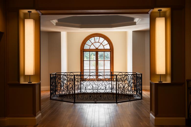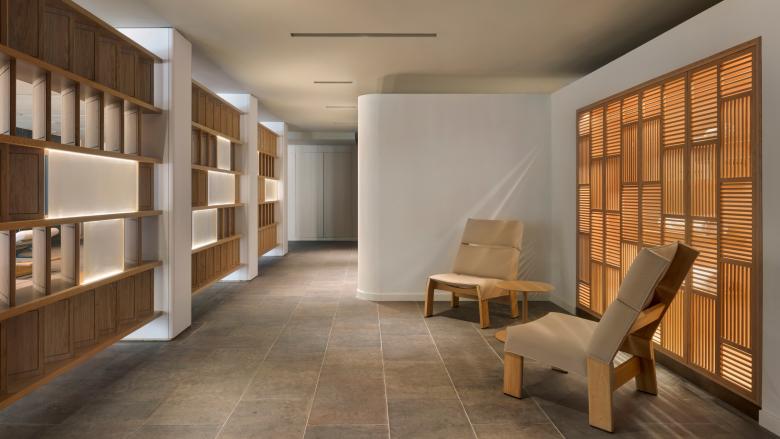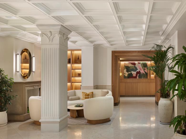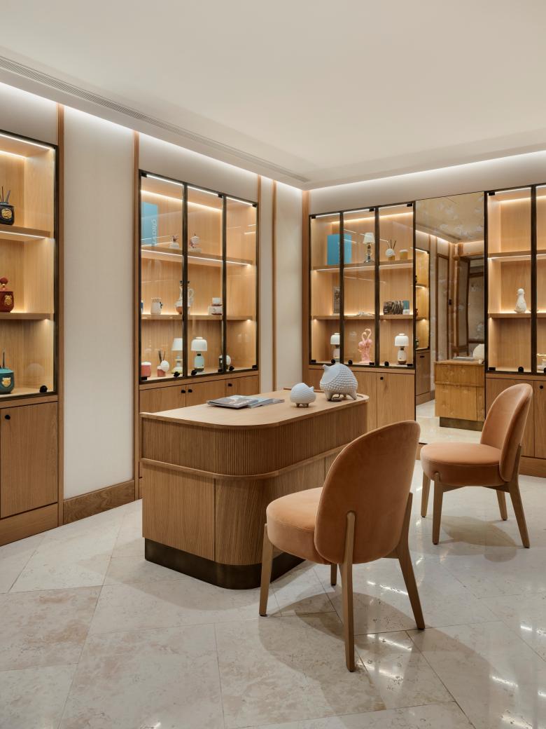 The architectural geometries of the central lobby were reconfigured to reinforce the spatial symmetry in relation to the octagonal atrium that connects to the guestroom floors. Facing the preserved marble grand staircase, Kokaistudios introduced a compact retail space—now occupied by Lladró—carefully integrated into the historic setting as a contemporary insertion.