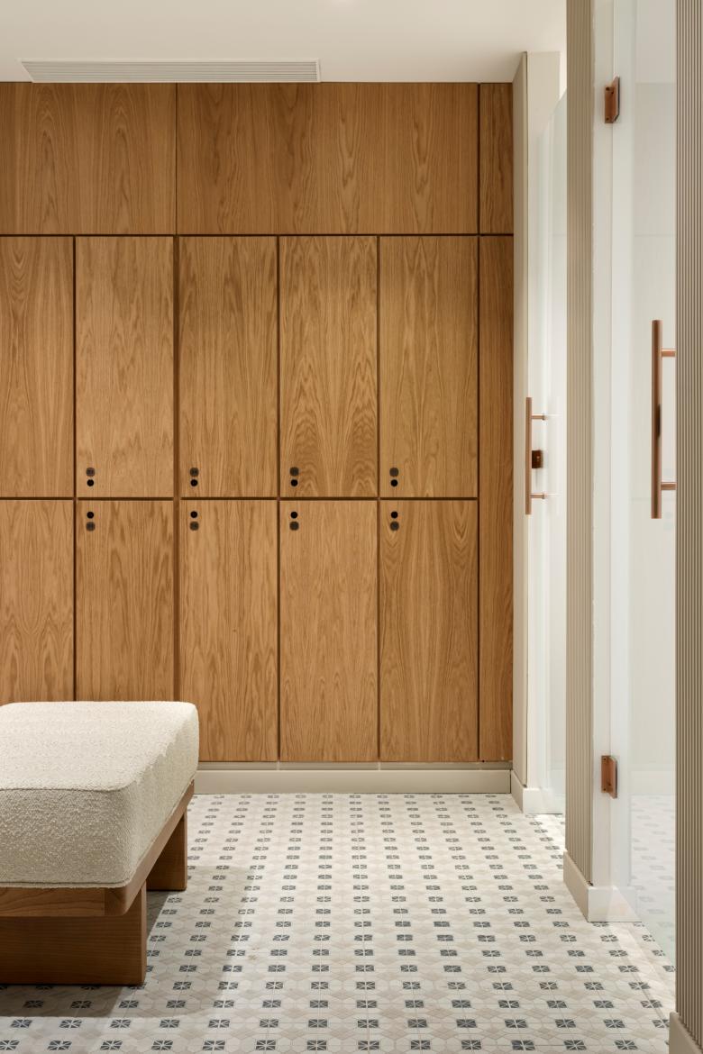 Within the indoor pool area, Kokaistudios redefined the vertical circulation by introducing a new staircase connecting the first guestroom level with the lower-ground floor, where the gym and spa facilities are located. This intervention consolidates the entire sequence—including the changing rooms equipped with sauna and steam rooms—into a coherent wellness zone, now operated by Valmont Spa.