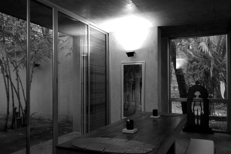 The course of action has been one of minimality in process rather than in appearance. Just as the plan has been reduced of elementality, so do the finishes employ reduction in layers/ materials. For instance, to drain the terrace valleys, sufficient measures were created within the slab while casting the RCC with required waterproofing ingredients, thus avoiding any additional layers for either waterproofing or slopes. The slab soffit has been left exposed; and the waterproof plywood sheets used as form-work were recycled to make the required furniture for the house. Paint - both from the wall and the plywood surfaces - has been done away with since the base layer of putty itself provides adequate protection. Similarly, the bedding mortar itself – when reconstituted and laid appropriately – gives the IPS floor-finish, thus avoiding the need for any further layer of stone or tile finishes. Each of these processes gives rise to its own appropriate aesthetic, just as rethinking the plan allows for a richer, if not new, spatiality. Nevertheless, both demand a shift from conventions (personal or collective), not only in the designer’s approach but also in the inhabitant’s ways of seeing.