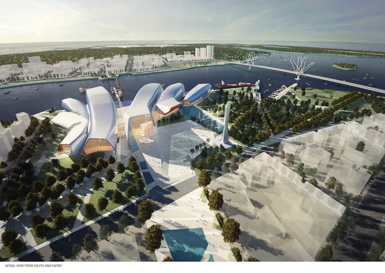 The architecture is expressive of multiple interpretations (such as an open hand, anemone, corals, vessels in port), not as obvious metaphors, but as enticements for visitation and exploration of a multifaceted set of experiences within.