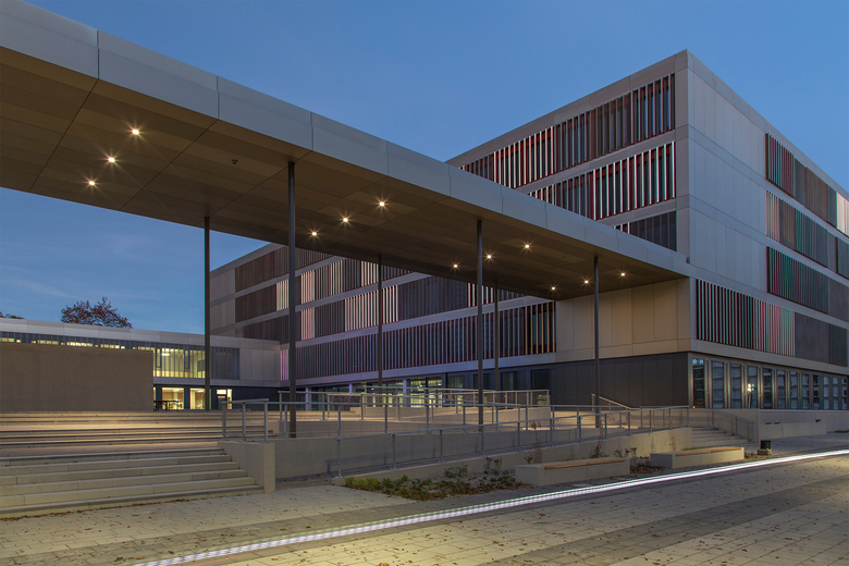 Fassade – Drehbare Vertikallamellen mit den Abmessungen 45 x 330cm werden als Permanentverschattungsanlage eingesetzt, die den Wärmeeintrag für das Gebäude wirkungsvoll und witterungsunabhängig verhindern und gleichzeitig natürliches Licht in den Klassen optimieren und Ausblicke ermöglichen. Die Lamellen werden auf auskragenden Stahlschwertern weit vor der Fensterkonstruktion angeordnet, um den vollen Drehradius zu schaffen. Die Stellung der eloxierten Alulamellen mit Streckmetallfüllung passen sich automatisch an den jeweiligen Sonnenstand, Wind und Temperatur an. So entsteht zum einen ein spannungsvolles Spiel aus offenen und geschlossenen Elementen, zum anderen verstärken die Lamellen im geschlossenen Zustand die homogene Körperlichkeit des Gesamtensembles.