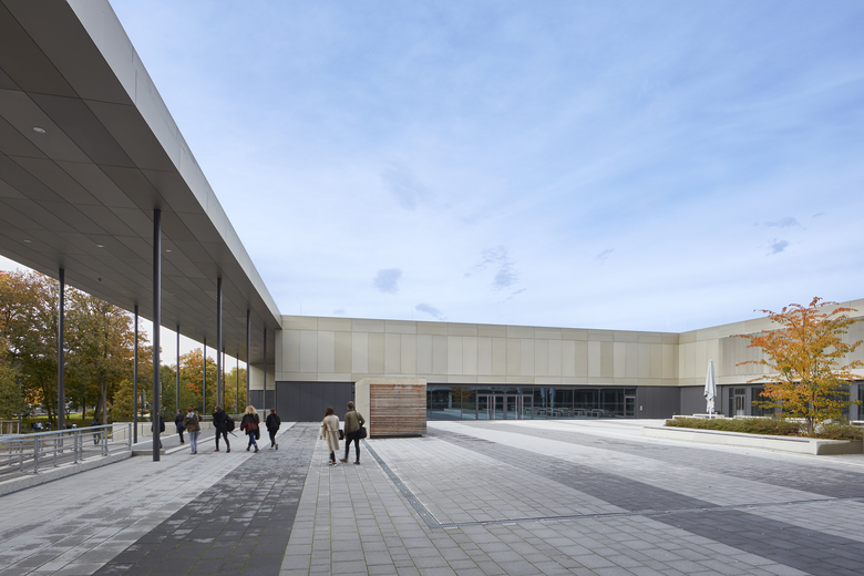 Durch das berufliche Schulzentrum sollen im heterogenen Umfeld stadträumliche Qualitäten geschaffen werden. Der Grünraum mit Baumkulisse wird dabei genutzt, um mit dem zweigeschossigen Sockel des Gebäudes einen boulevardartigen Erschließungs- und Freiraumbereich zu definieren, der die Besucher in die Mitte der Schule führt. Dieser zentrale Eingangsplatz für Schule und Sporthalle wird durch einen kolonnadenartigen Filter gefasst. Gleichzeitig findet sich hier die Mittagsbetreuung mit Außenraumbezug. Mit der südlichen Anordnung des hohen Schulgebäudes werden Bezüge zur künftig anschließenden Bebauung hergestellt. Der ruhende Verkehr wird weitgehend in dem natürlich belüfteten Sockel angeordnet.