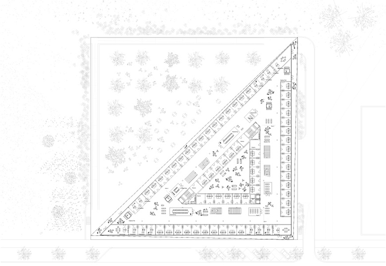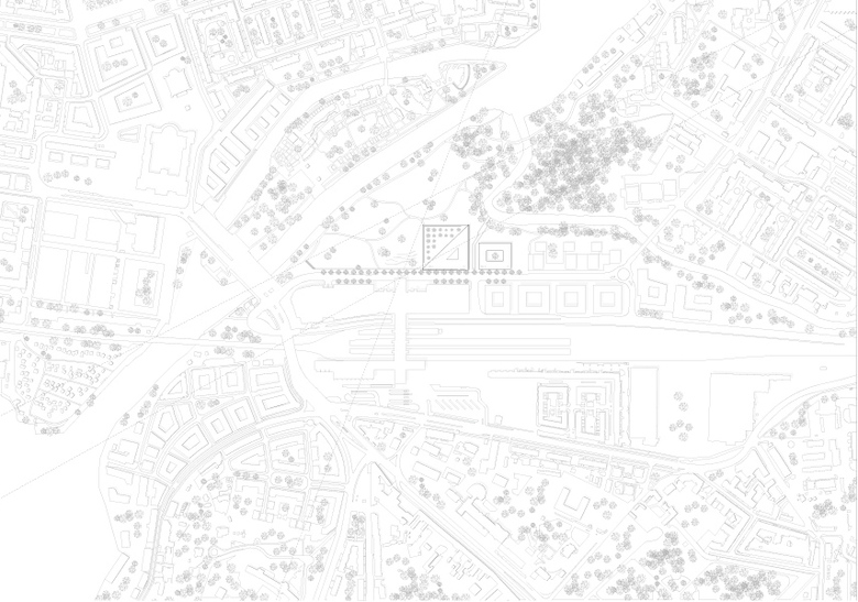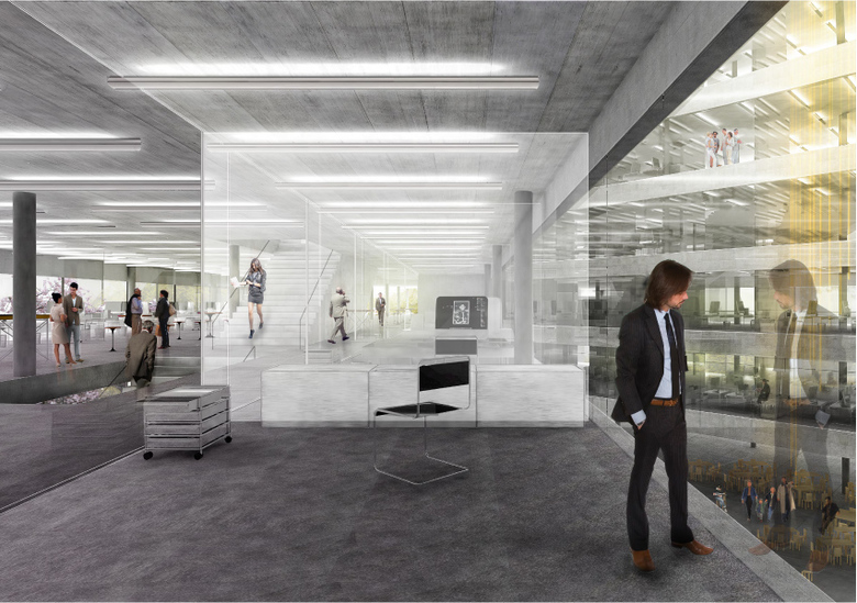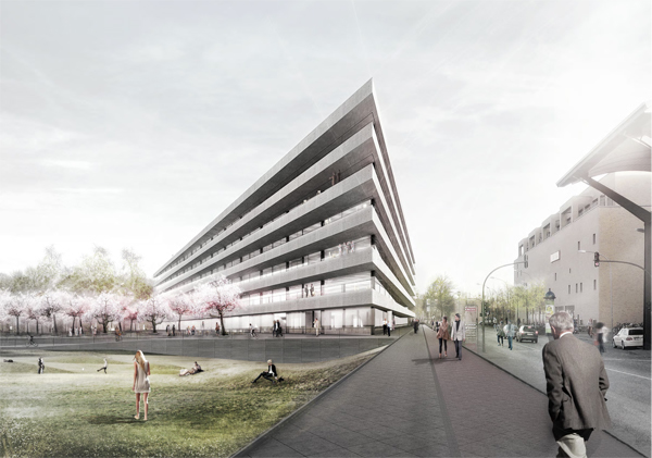 Der Wettbewerbsentwurf verhält sich städtisch zur Babelsberger Straße und bildet eine klare Kante zum Landschaftsraum. Er nimmt den Maßstab der umliegenden Bebauung auf und setzt gleichzeitig einen Akzent als Landmarke. Die bestehende Topographie wird durch Ausrichtung und Position des Hauses aufgenommen, die verschiedenen Niveaus werden verknüpft und gleichzeitig in Ihrer Gegensätzlichkeit gestärkt. Auf Straßenniveau bildet sich eine öffentliche Terrasse mit Aussicht zur Potsdamer Kulturlandschaft aus. Durch die Terrasse verzahnt sich das Haus mit der Umgebung. Die lange Fassade des dreieckigen Baukörpers wendet sich ganz der Auenlandschaft zu und öffnet Blickbeziehungen auf die historische Stadtlandschaft. Der Neubau der Investitionsbank des Landes Brandenburg vereint alle Anforderungen und Arbeitsprozesse eines nachhaltigen und zeitgemäßen Bürogebäudes.