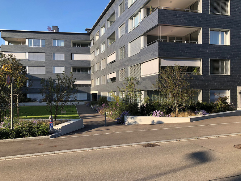 Das neue Mehrfamilienhaus lehnt sich an den Fuss der auslaufenden, zweitletzten Nagelfluhbank der regionaltypischen Schichtrippenlandschaft von Rapperswil-Jona.