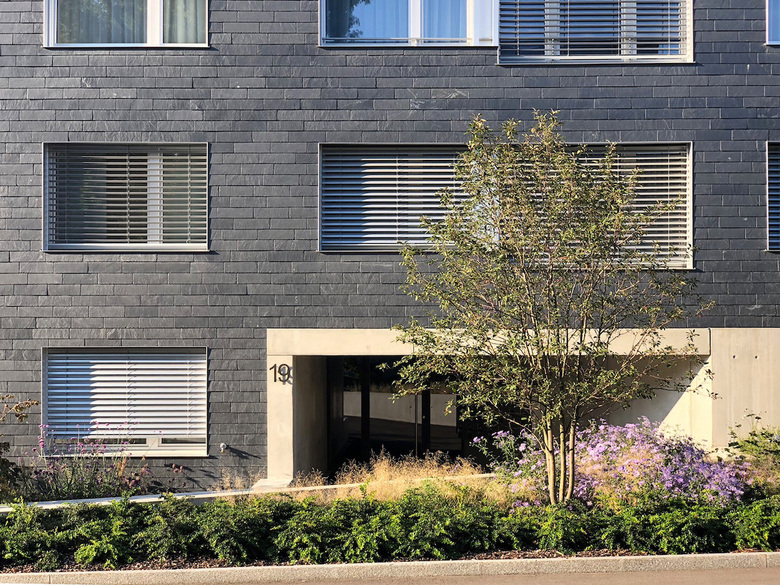 Die Fassade wird mit blaugrauem Eternitschiefer verkleidet und mit einem Betonsockel gegen die Umgebung abgeschlossen. Dies verleiht dem Gebäude eine Art fliessende Haut.
