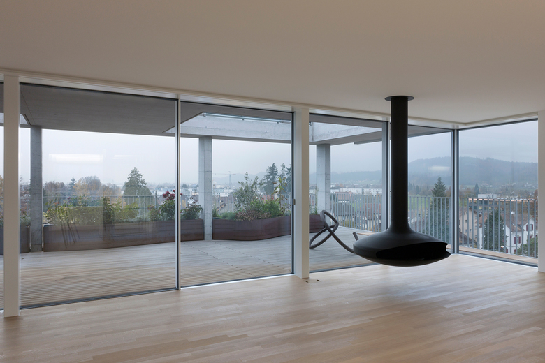 Die ehemalige Hauswartwohnung auf dem Dach dient nach wie vor dem Wohnen und Rückzug, wurde aber räumlich komplett umgedeutet. Dem Wunsch des Bauherrn entsprechend wurde die kleinteilige Zimmerstruktur ohne starken Bezug zur Terrasse zugunsten eines grosszügigen Raums für die Bewirtung von Gästen aufgehoben. Ähnlich wie im Schaulager das Archivs zoniert die Küche den Raum in einen Schlafbereich mit kleiner Ankleide und einen grösseren Wohnbereich. Über grossformatige Glasschiebetüren erweitert sich der Raum auf die Terrasse, der herbe Charme des Gewerbegebiets am Gleisfeld, die unmittelbare Nähe zum intakten Altstadtkern von Zofingen und eine grossartige Fernsicht auf die Berner Alpen werden zu prägenden Elementen der ganzen Wohnung. Das neue Dach fasst die Terrasse räumlich und wertet sie zum eigentlichen Aussen-Wohnzimmer auf.