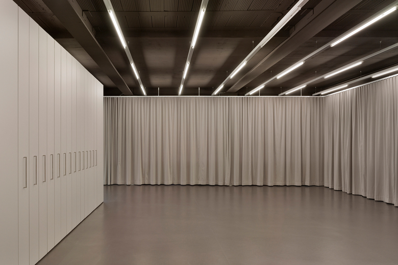 Die stützenfreie Grundrissstruktur des Bestandes begünstigte ein Raumkontinuum mit spezifischen und auf die verschiedenen Nutzungen zugeschnittenen Qualitäten. Das Schaulager auf der neuen Eingangsebene wird, neben der Archivierung, für Ausstellungen, Lesungen und Konzerte genutzt und ist zeitweise einem breiteren Publikum zugänglich. Hier zoniert das Archiv für die rund sechshundert Kunstwerke der Sammlung den Raum in einen Veranstaltungs- und Ausstellungsbereich und definiert kleinere Bereiche zum Arbeiten und Aufenthalt. Mit Theatervorhängen kann die Raumteilung verändert, Belichtung und Raumakustik auf die gewünschte Atmosphäre angepasst werden.