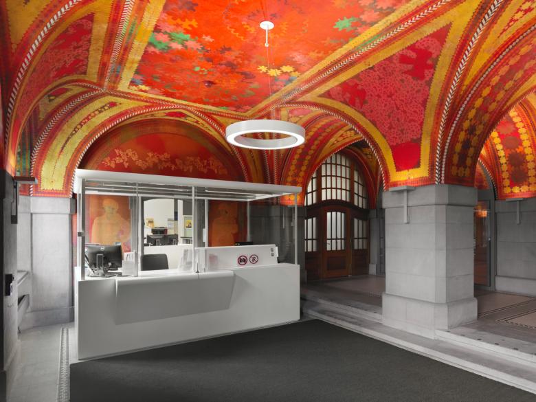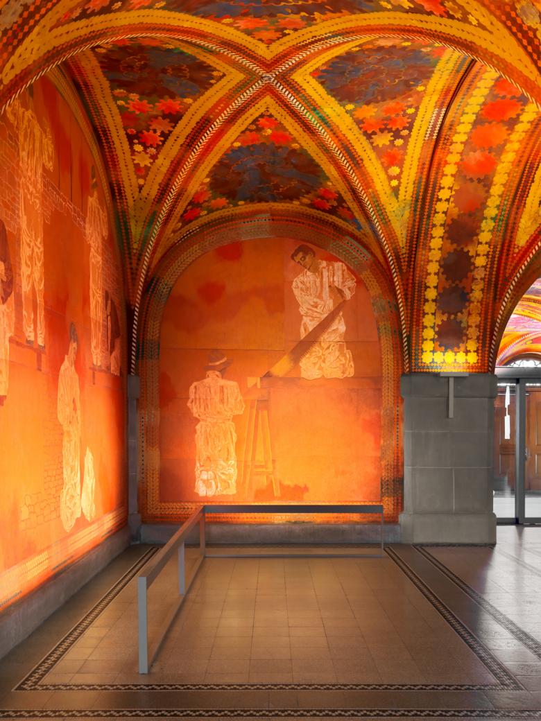 Mit dem Fresko von Augusto Giacometti beherbergt das Amtshaus I eines der bedeutendsten Kunstwerke der Stadt. Im Zuge der Gesamtsanierung wurden wir mit der Konzeption und Planung einer neuen Beleuchtung beauftragt. Wir ersetzten die alten, auffälligen Leuchten mit einer diskreten Beleuchtungslösung. Die Lichtabgabe setzt nun präzise über den Sandsteinsäulen ein und steigert sich sanft bis zum Zenit der Kuppeln. Durch Ermittlung der optimalen Farbtemperatur am Werk und der hervorragenden Farbwiedergabequalität der eingesetzten LEDs, wird die einst als tiefrot empfundene Malerei zu einer ungeahnt frischen, farbigen Welt. Sonderkonstruktionen, wie Abschrankungen mit integrierten Leuchten, welche die vier Wandbilder ausleuchten und hinterleuchtete Fenster ergänzen unsere Interventionen.