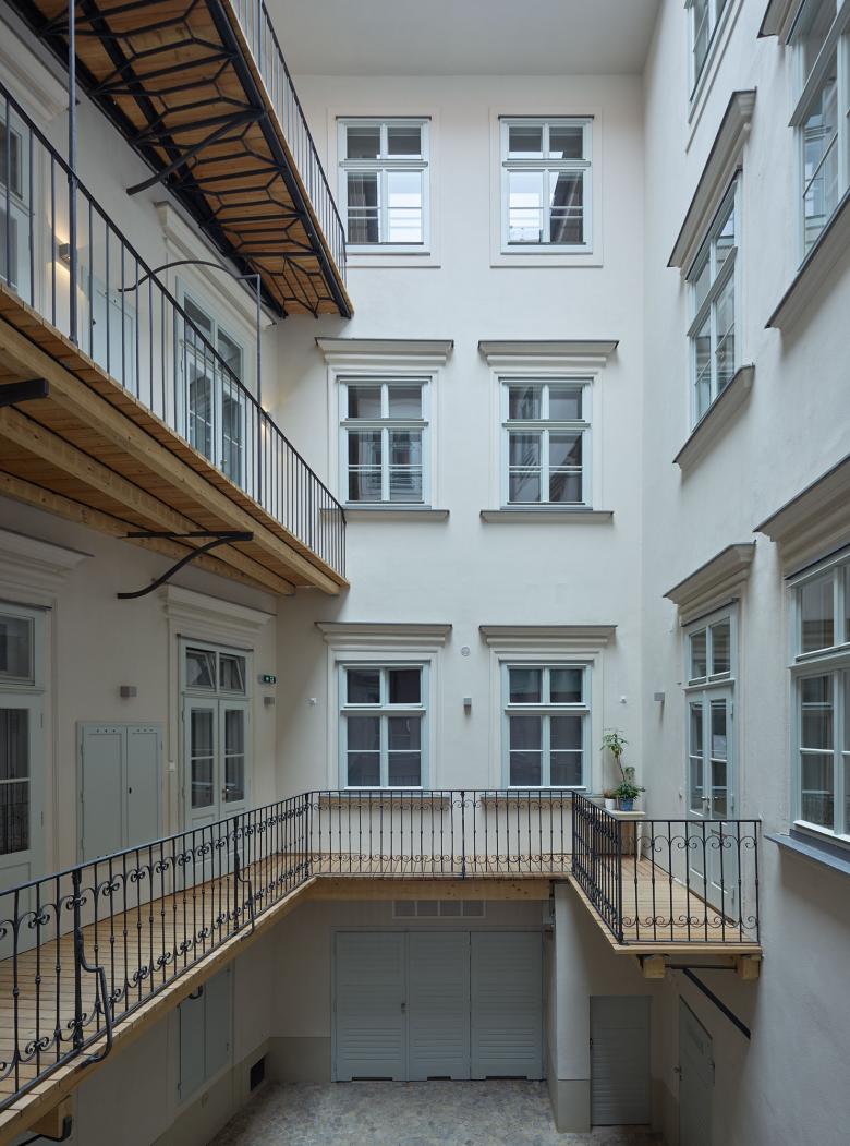 Nun erfolgte die nächste Metamorphose. Den von der WISEG – Wiener Substanzerhaltungs-GmbH & Co KG ausgeschriebenen Wettbewerb für die Sanierung des Hauses gewann das Büro P.GOOD Praschl Goodarzi Architekten ZT GmbH, das über reichliche Erfahrung im sensiblen Umgang mit Bausubstanz verweisen kann, von Gründerzeithäusern bis zur Wiener Werkbundsiedlung. „Es ist das älteste Haus, das wir bisher saniert haben,“ sagt Architekt Martin Praschl. Die Sanierung erfolgte in enger Absprache mit dem Bundesdenkmalamt (BDA), die Erfahrung der Architekten half dabei, von Anfang an ein Klima des Vertrauens zu etablieren.