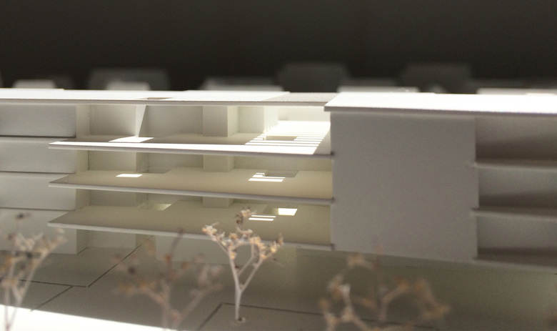 Integrativer Bestandteil der Überbauung ist der zentrale Hof welcher mit seinen Aussenraum Qualitäten ein lebendiges Quartierleben und den Austausch fördert. Die präzise gestalteten Freiräume zeichnen sich durch spezifische Themen aus und fördern dank seiner hohen Durchlässigkeit die externe, wie auch die interne Siedlungserschliessung. Der Freiraum ist in öffentliche, halb-öffentliche und private Aussenräume differenziert. Diese Hierarchie hilft dem Bewohner sich auf dem Areal zu orientieren und bietet auch der umliegenden Nachbarschaft die Möglichkeit die halb-öffentliche Infrastruktur mit zu nutzen und sichert somit eine rasche Vernetzung der neuen Überbauung mit seiner Umgebung. Die zur Nordseite grossen und einladenden Durchstiche holen die Passanten an der Oberseestrasse ab und geleiten Ihn intuitiv an den Hauszugängen des Nordbaus vorbei in den Innenhof, wo das innere flexible Wegnetz Ihn zum Südbau weiterführt. Am Südbau findet sich das selbe Konzept wieder, jedoch in einem kleineren und intimeren Massstab und filtert dabei Bewohner von einem zu grossen Transitverkehr quer durch das Areal.