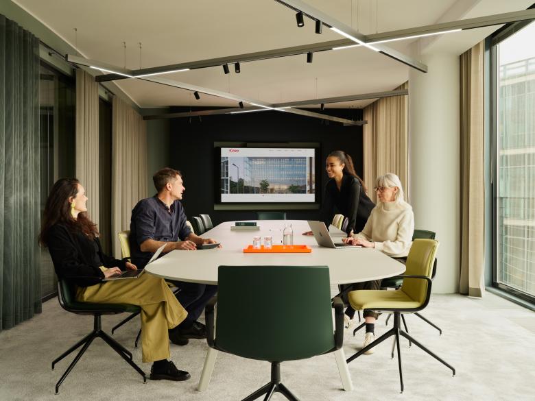Neben den offenen Arbeitsbereichen wurden Räume mit spezifischen Funktionen individuell inszeniert. So verfügt der Video-Call-Raum über zwei Keylights, die links und rechts neben dem großen Bildschirm positioniert sind. Sie lassen sich manuell in Helligkeit und Farbtemperatur regulieren, sodass sich die Lichtstimmung optimal an persönliche Vorlieben und die jeweilige Tageslichtsituation anpassen lässt.