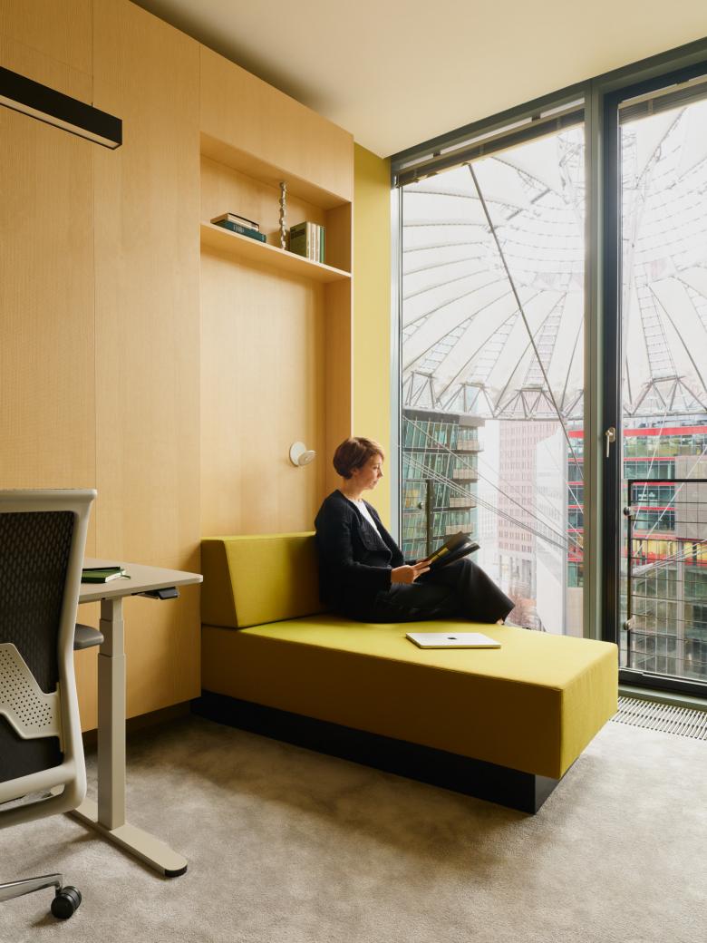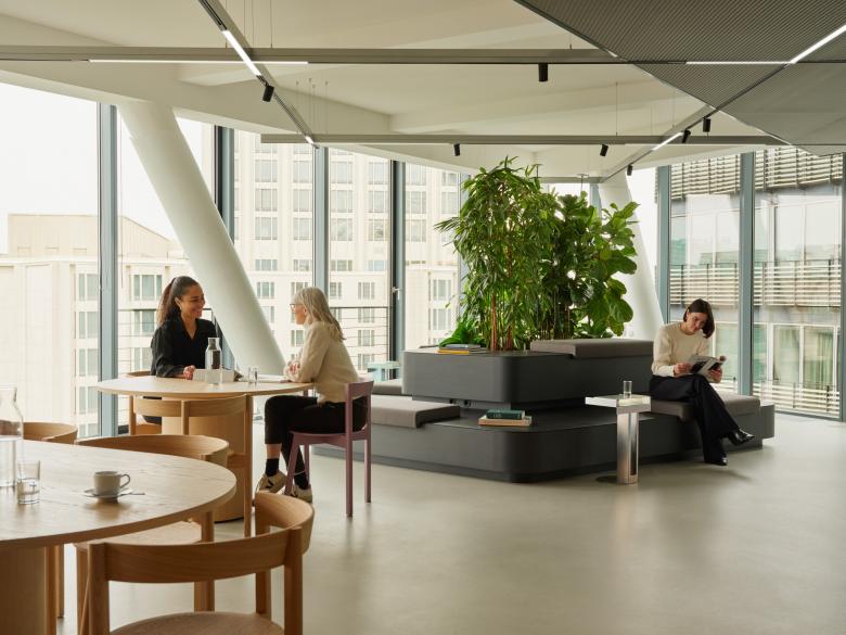 Alle Einzel- und Doppelarbeitsplätze sind mit Human Centric Lighting (HCL) ausgestattet. Die Nutzer:innen können aus drei voreingestellten Lichtstimmungen wählen, passend zu ihrer aktuellen Aufgabe. Im Hintergrund verändert sich die Farbtemperatur automatisch entlang einer dynamischen astronomischen Kurve, die sich täglich neu anpasst. Diese sanfte Anpassung bleibt für die Mitarbeitenden unmerklich und unterstützt den zirkadianischen Rhythmus, ohne den Arbeitsfluss zu stören.