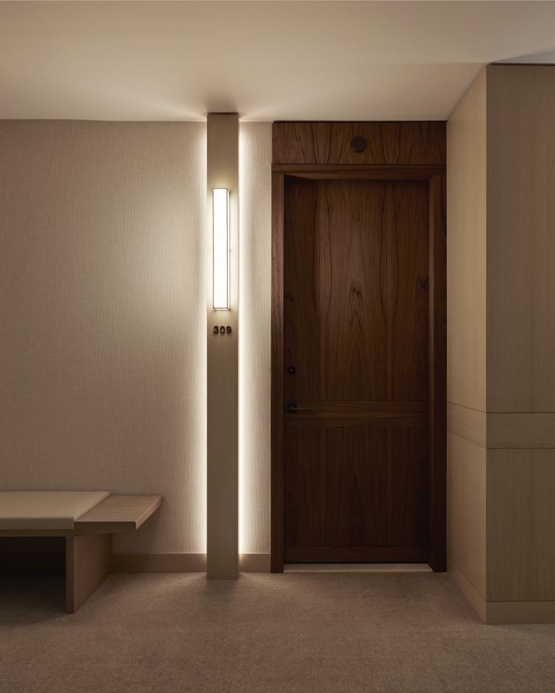 Materials played a key role in unifying but creating distinct guest experiences between the ground floor dining & gathering spaces and the Hotel areas above. The space draws on signature Nobu design elements combined with traditional Japanese materials and an open environment to engage the street front. The ground floor restaurant and lounge is layered with warm wood wainscoting, flooring, and furniture, while back-lit from rice-paper glass walls. For the Hotel reception and guestrooms, this relationship to light and dark is inverted; light marble flooring, bleached white oak paneling, and grasscloth wall covering contrast moments of rich bronze and teak details.