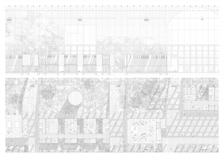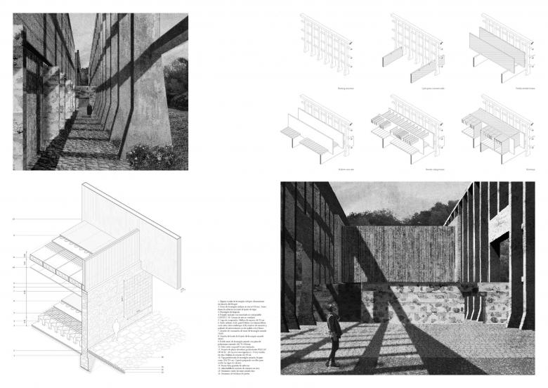 As grief and remembrance of beloved ones do not follow a linear itinerary, the proposed cemetery comprises numerous paths, as many as responses to loss. In all of them, the certainty of a familiar environment is abandoned to penetrate the unknown, the captivating landscape of our memory. A route is laid along the abandoned productive infrastructure, leading upwards from the factory compound at the side of a road to a deserted marl quarry. Along the paths, architecture appears and disappears amid the natural setting, giving support to the mourning processes. The huge industrial mass has vanished, and only the concrete structures that could not be disassembled remain. Large gravel silos and the skeleton of a cement warehouse avert, at least metaphorically, the absence of the neighbourhood’s focal point. Cyclopean concrete walls made from the quarry stone allow the visitor to start their journey intuitively, traversing the exposed frame. The cemetery facilities, concealed behind the original structure, do not interrupt the crossing paths. Large slender beams rest on the cyclopean walls, giving shape to the ancillary pavilions. Within, indoor and outdoor spaces blend to provide comfort and serenity to mourners. The route continues and subtly leaves the plain, ascending towards the quarry. On the way, a voluminous dome silo is altered by two slits which bring light and surrounding views to the inside, characterising the void space. Opposed to the clear direction followed earlier, along the quarry the paths bend and fork, seeking gentle slopes that soften the abrupt topography. Barely noticeable, a concrete band alongside the trails reveals shifting positions and creates seats or platforms pursuing the views far away. In here, each person finds its place of repose, from traditional burials at the base of a cliff to ash scattering in reforested terraces. Attitude towards death has changed, and inevitably, also the way of perpetuating memory. The cemetery welcomes all intimate decisions, and the paths help to further discern how nature, life and architecture are indissolubly connected.