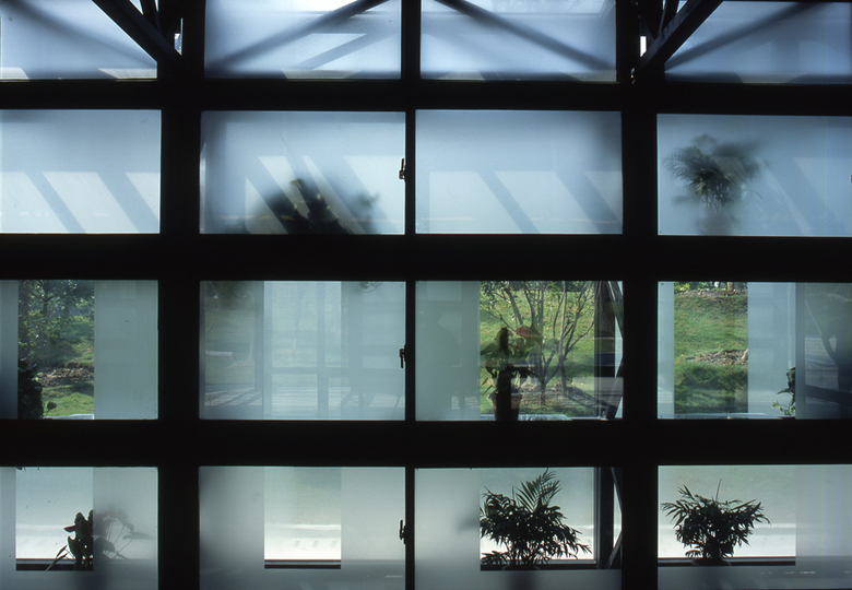 First, we added two tiers of shelves in the cavity to allow potted plants to grow there. The “green” walls will resonate with the greenery outside, relating the building to the park. The café or gift shop which will occupy the rental space can also use part of the walls to display their merchandize or decorations. Secondly, the glass skins are made of sand-blasted glass with small transparent areas. The locations of the transparent areas in the two skins are overlapped. People will see at least three kinds of depths, the frosted front layer, the cavity with the frosted back layer, and a complete transparent opening. These “windows” will form varied overlapping effects when the viewer moves. Each building has a different frosting pattern to form its own identity.