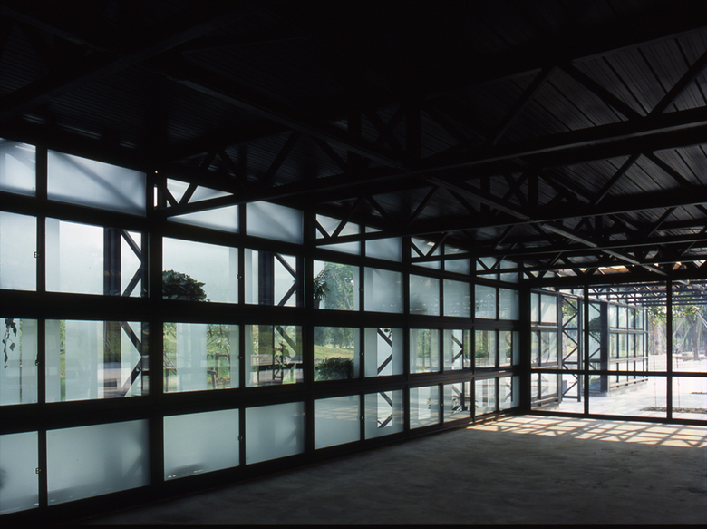 We intentionally avoided the stereotyped approach that treats indoor and outdoor spaces as separated systems, such as placing a patio “outside of” a room. The three 36-by-14 meters building plans seem to be composed of conventional rooms and corridors. But the “rooms” include indoor spaces, semi-outdoor (having a roof but no walls) spaces, and outdoor spaces under trellises. The three indoor spaces (rental, snack shop and public restrooms) were not grouped into one chunk, but rather mingled with the outdoor spaces to allow visitors use them conveniently. We selected long-span rigid frame for the building structure to eliminate any columns inside the building, permitting us to place non-bearing walls and roofs freely so that indoor and outdoor spaces could be better integrated.