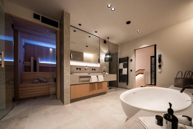 Jede Suite umfasst rund 100 m² und erstreckt sich über zwei Ebenen. Ein großzügiger Wohnbereich mit Loggia, Teeküche und Gästebad befinden sich im Erdgeschoss; Schlafraum, zweite Terrasse und ein privates Spa-Bad im Obergeschoss. Sauna, Infrarot-Sauna, Dampfdusche, freistehende Badewanne und eine Whirlpool-Loggia schaffen einen exklusiven privaten Wellnessbereich – stets mit Blick in die Bergwälder des Südharzes.