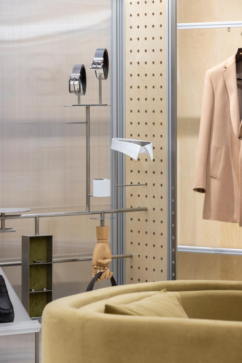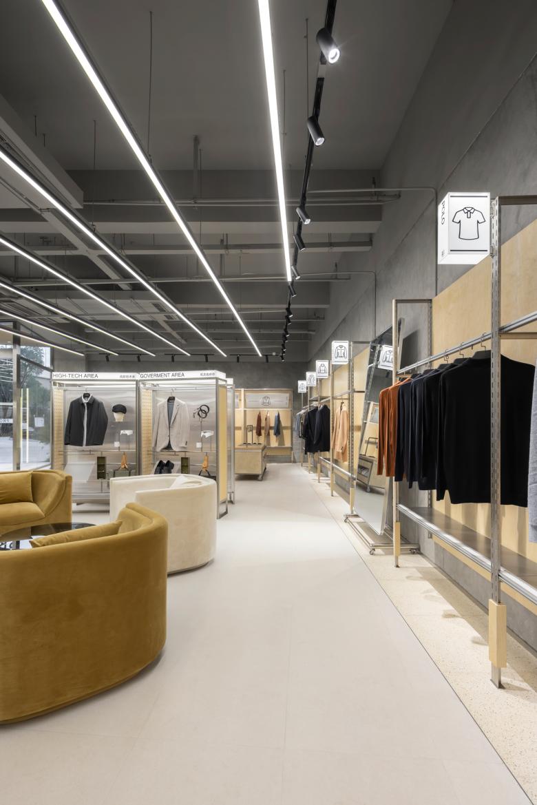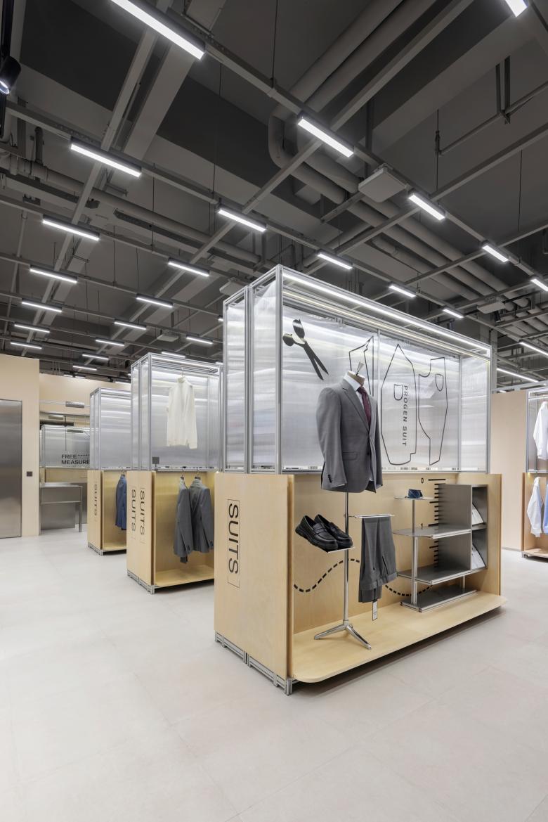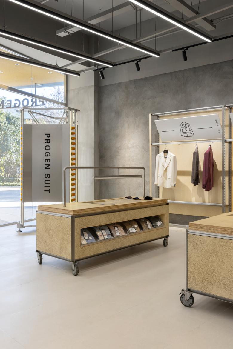 A simple and easy-to-assemble editable display system, constructed from the idea of a recyclable wardrobe, brings lower labor and manufacturing costs to Progen Suit and effectively reaches the construction of numerous stores. Using this design strategy, the Progen Suit store has successively landed in cities such as Shanghai, Hangzhou, and Ningbo for three years.