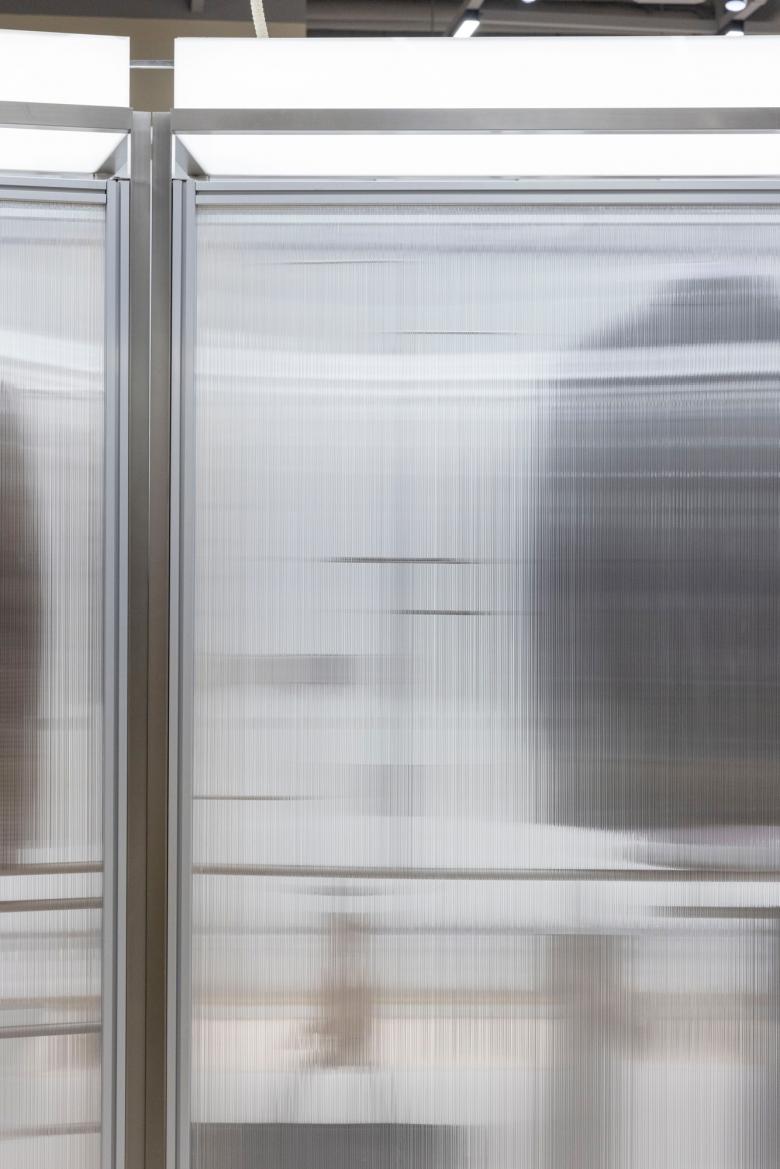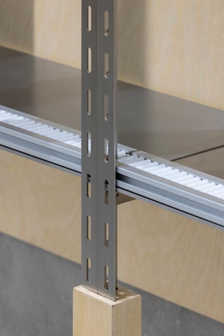 The standard wardrobe solves the problem of display height, width, and bearing itself by using a 30mm X 30mm T-Slotted Profile for Interlocking in different ways. This profile was selected for its flexibility in assembly, as well as its lightweight and cost-effective. It is applied with birch plywood and PC panels to form a standard wardrobe. The groove of profiles can not only be used as the main connection for installing slots, and connectors, but also for LED lighting strips, meeting the detailed lighting needs of the display.