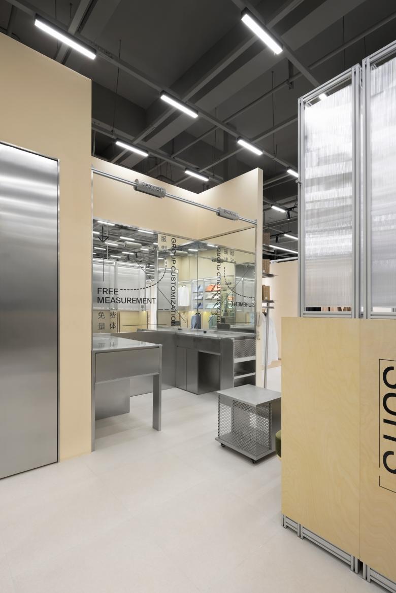 The window display testing booth meets the landing test of the brand before launching new window display ideas in different stores in the future. In this way, the brand can more efficiently form a complete and mature system for the replication of future stores and promote it to the market. The SI store is fully displayed in the store in a 1:1 model, with spatial functions of display area, measurement area, custom area, and changing room arranged.