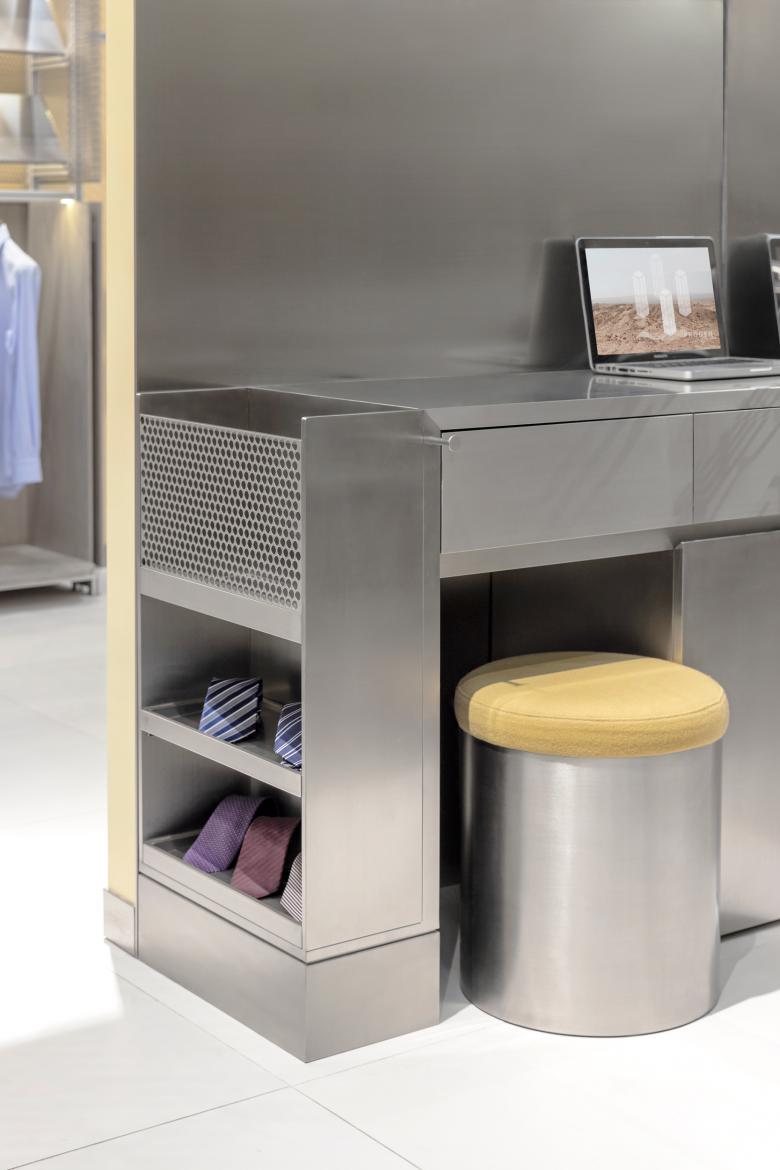 The window display area facing the street needs to meet more operational changes. The design of the stainless steel track on the ground forms an interesting action track, which is convenient for the position adjustment of the display trolley and the mutual movement between different combinations, thus meeting the changes in dis-play during different periods.