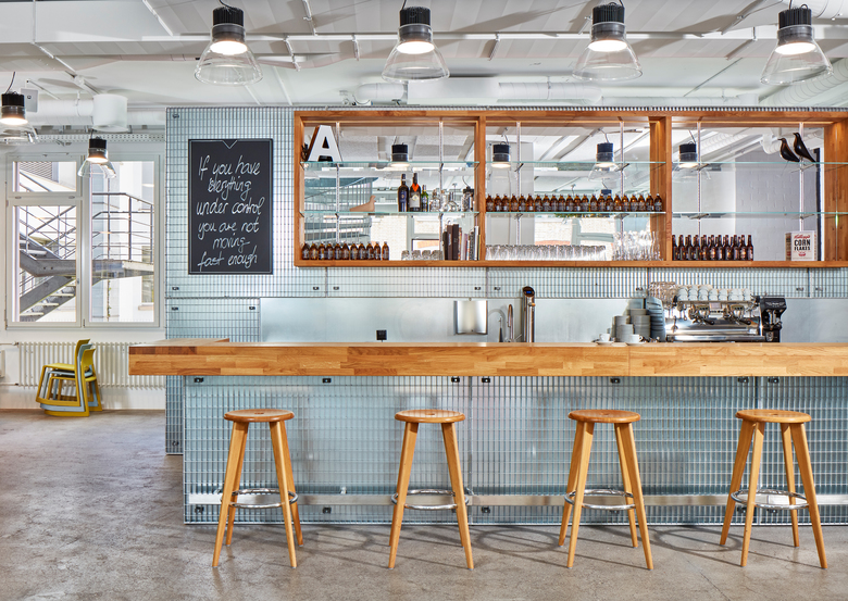 Als Bühne für PwC’s neues Experience Center dienen zwei Stockwerke in einem Gewerbehaus mit einer Gesamtfläche von 1’500m2. Der gängige Empfangstresen wurde durch eine Kaffeebar ersetzt, die als zentraler Begegnungsort der Firma zum Auftanken, Arbeiten und Spielen einlädt. Die Bürofläche wird durch wenige verglaste Räume strukturiert und mit mobilen Akustikvorhängen können unterschiedliche Zonen gebildet werden.