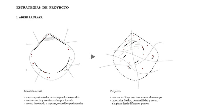 Todas las acciones de la propuesta ganadora del concurso van encaminadas a revitalizar este espacio para los vecinos. De esta manera el proyecto plantea en un primer momento derribar los muros de ladrillo que encierran la plaza para posibilitar flujos naturales a pie que ahora mismo se ven interrumpidos.