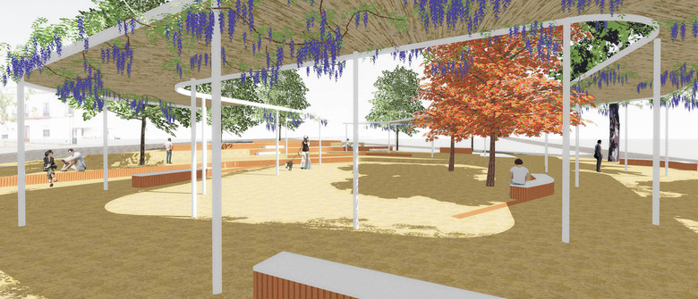 La plaza trabaja también con la componente temporal que aporta riqueza y variabilidad a través de la selección de especies. Se proyectan unos árboles caducifolios de crecimiento rápido y una pérgola metálica de trazado sinuoso que acompañan al peatón en sus posibles recorridos, proporcionando un lugar de refugio. El entramado de mimbre de la pérgola funciona como filtro de luz que proporciona sombra desde el primer momento. A medio y largo plazo quedará invadido por unas enredaderas que en primavera y en invierno tienen una floración azul y lila espectaculares. La estructura metálica propicia además usos flexibles ya sean expositivos, de celebraciones, fiestas, lúdicos, etc.