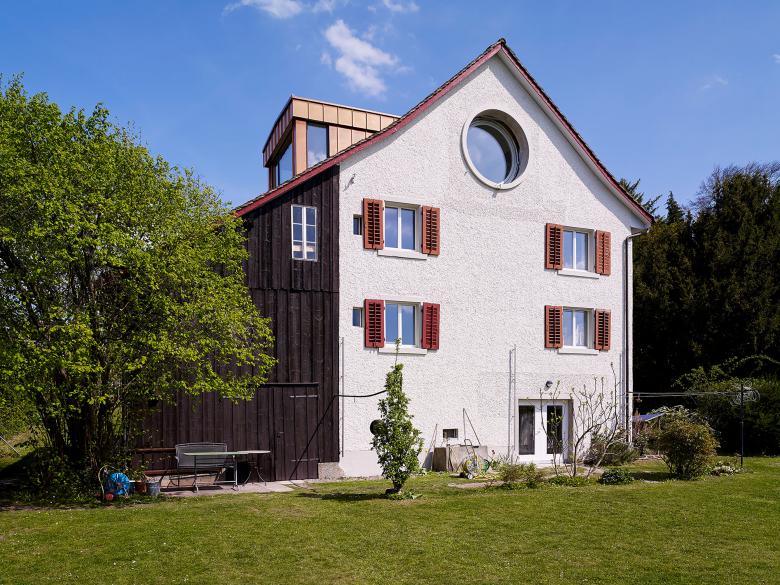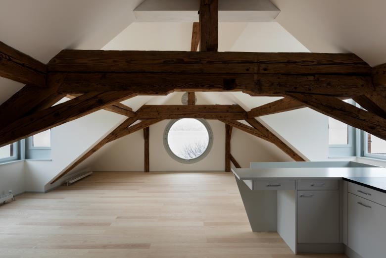 Im imposanten Dachstuhl des mehrere hundert Jahre alten Hauses soll eine weitere Wohnung realisiert werden. Sowohl in gestalterischer wie auch in technischer Hinsicht erweist sich diese Aufgabe als sehr anspruchsvoll, da der Wunsch nach einer hellen, lichtdurchfluteten Wohnung mit grossen Fensteröffnungen im Gegensatz zu der Lage im Dach steht. Ein harmonisches Erscheinungsbild eines Hauses wird in hohem Masse durch das Dach geprägt. Als Konsequenz daraus beschränkt sich der Eingriff auf zwei Massnahmen, welche gegen Aussen in Erscheinung treten und im Innenraum maximale Qualität herstellen: Zwischen zwei Binder-ebenen wird eine Lukarnenkonstruktion, gleich einem Tisch, auf die jeweiligen Längsfassaden gestellt. Das neue Volumen durchstösst den Dachstuhl in seiner ganzen Breite und mit den Übereckverglasungen wird der Blick auf die Umgebung allseitig freigegeben. Seeseitig fügt sich das Rundfenster harmonisch in die Fassade ein und rahmt den Blick auf den See.