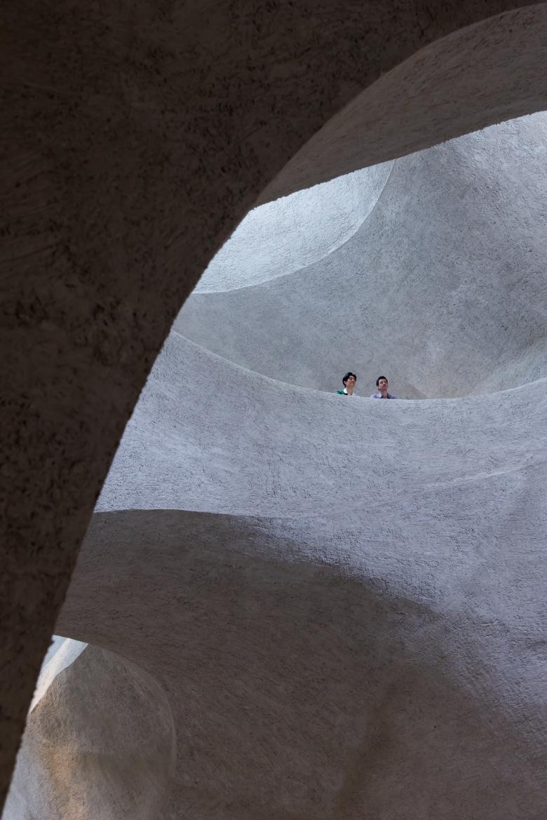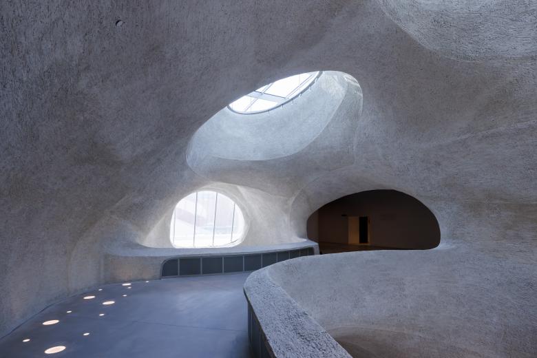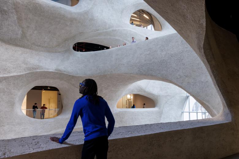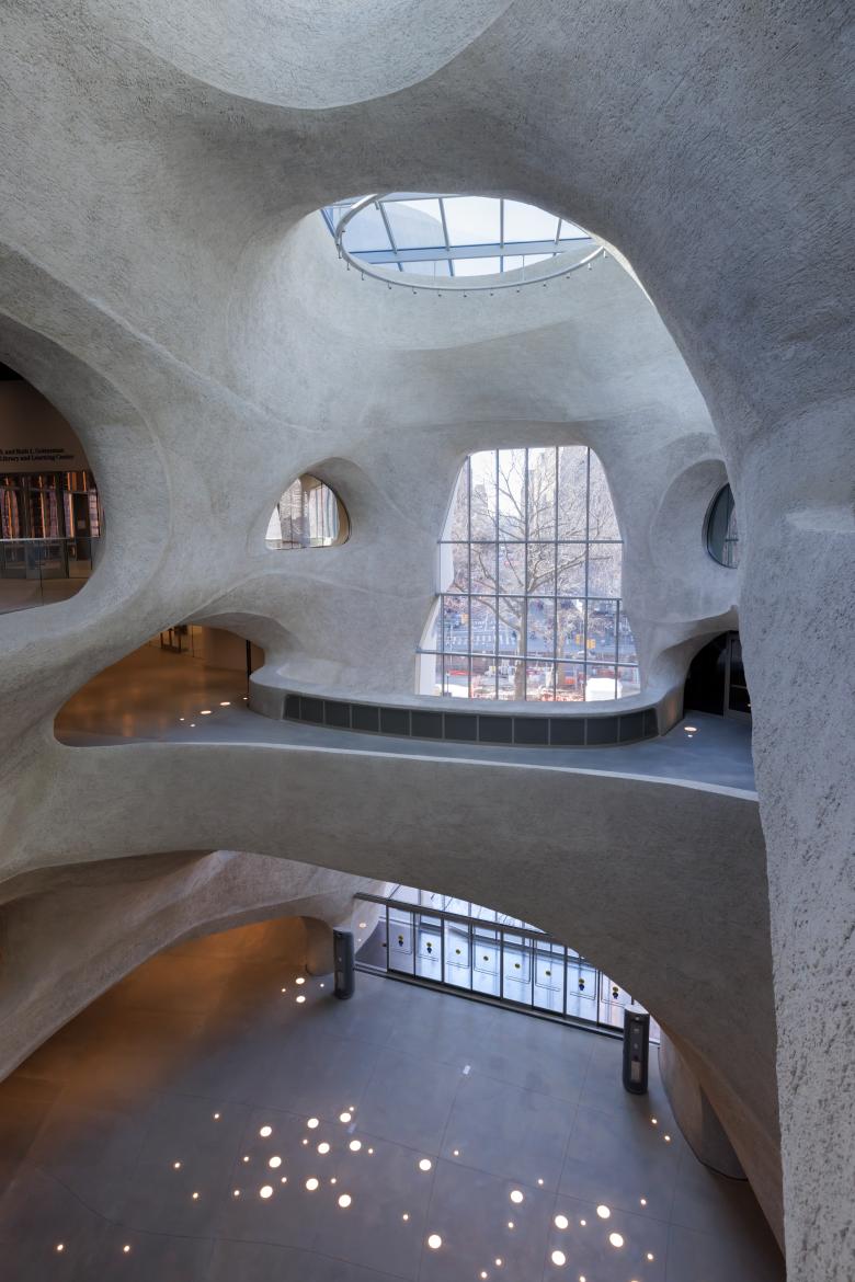 Natural form-making processes informed the Gilder Center’s architecture. Akin to a porous geologic formation shaped by the flow of wind and water, the building’s central, five-story atrium greets arriving visitors like an intriguing landscape, ready to be explored. Opening the building to natural daylight, the atrium structure also provides intriguing views into different spaces while bridging physical connections between them. Its structural walls and arches carry the building’s gravity loads. It is constructed using shotcrete, a technique primarily used for infrastructure, which sprays structural concrete directly onto rebar cages that were digitally modeled and custom-bent. Eliminating the waste of formwork, the technique achieves a seamless, visually and spatially continuous interior, whose form extends outward to greet the park and neighborhood beyond.