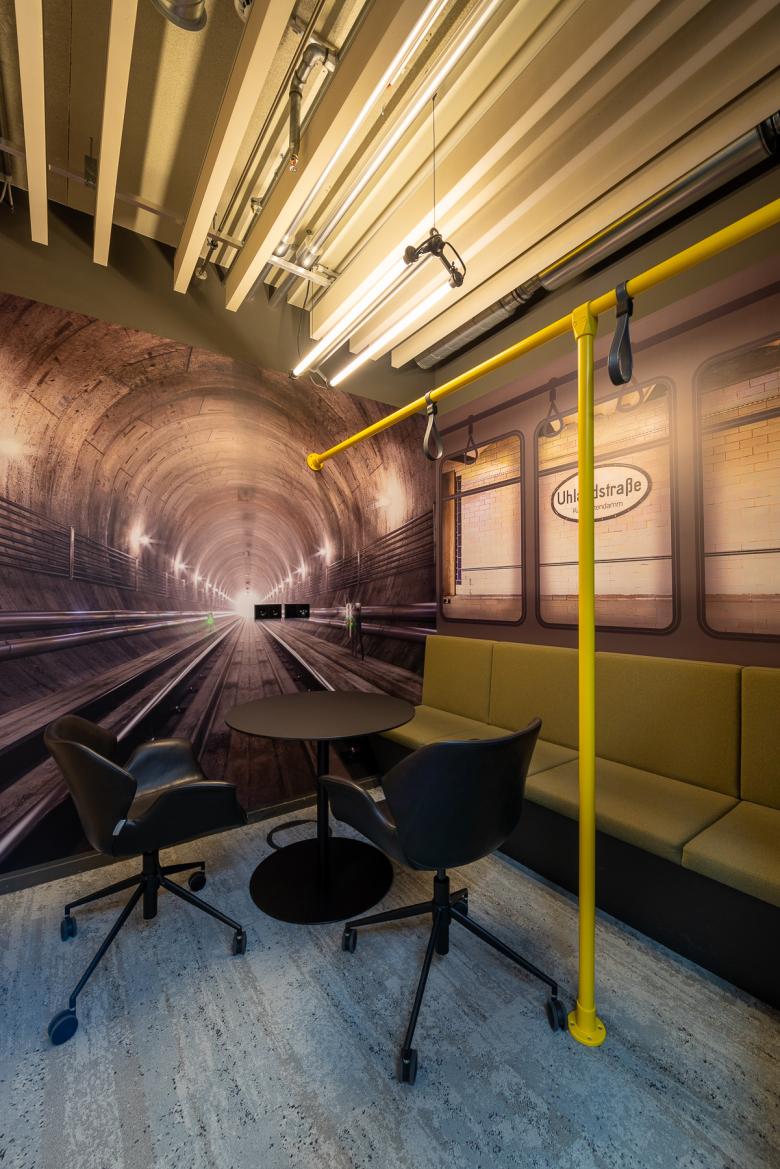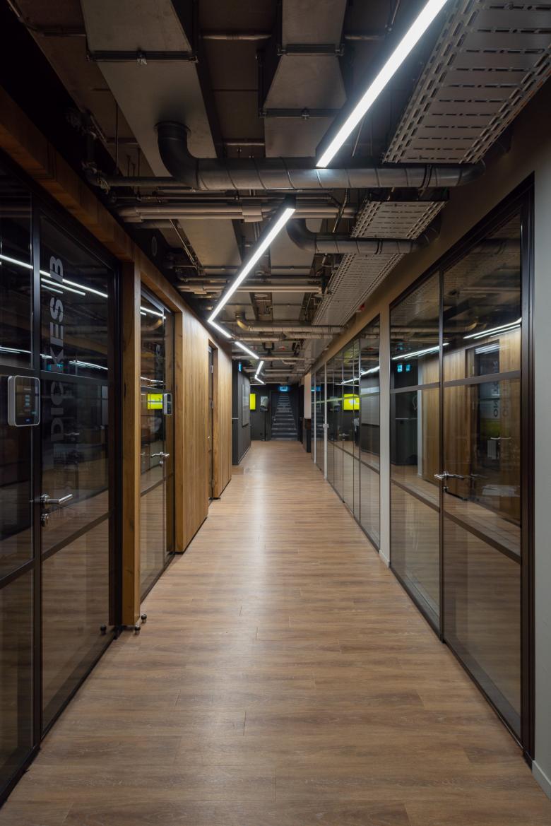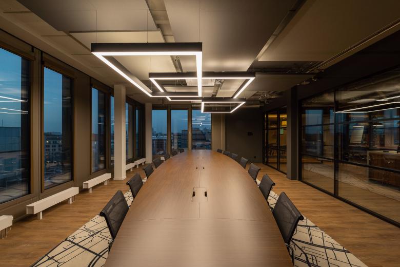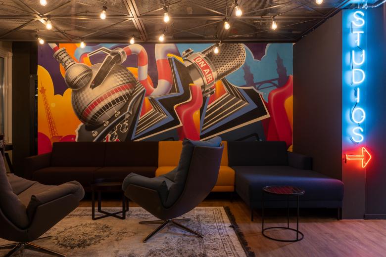 Für uns als Lichtplaner bedeutet dies für jeden Raum eine individuelle Beleuchtungslösung bereit zu stellen und gleichzeitig wiederkehrende Gestaltungselemente zu etablieren, die ein ganzheitliches Design erkennen lassen. Die Arbeitsplatzbeleuchtung erfolgt über Stehleuchten und schafft somit eine optimale, nutzerindividuelle Beleuchtung. Der Indirektanteil wird über Präsenzmelder geschaltet, der Direktanteil ist individuell von jedem Mitarbeiter in der Helligkeit an der Leuchte steuerbar. Neben der zurückgenommenen Allgemeinbeleuchtung aus der Decke und integrierten Beleuchtungslösungen für Wände im Empfangs- und Studiobereich haben wir für das Projekt eine breite Palette an dekorativer Beleuchtung sorgfältig zusammengestellt. Den Charme Berlins versprühen restaurierte Industrieleuchten in einzelnen Bereichen, moderne Meetingraum-Lichtlösungen, sowie handgefertigte Neon-Schriftzüge. Ein wiederkehrendes Element sind die zick-zack-förmigen Leuchten an den Decken im Flurbereich, welche an Radiowellen erinnern und intuitiv durch die Räumlichkeiten leiten.